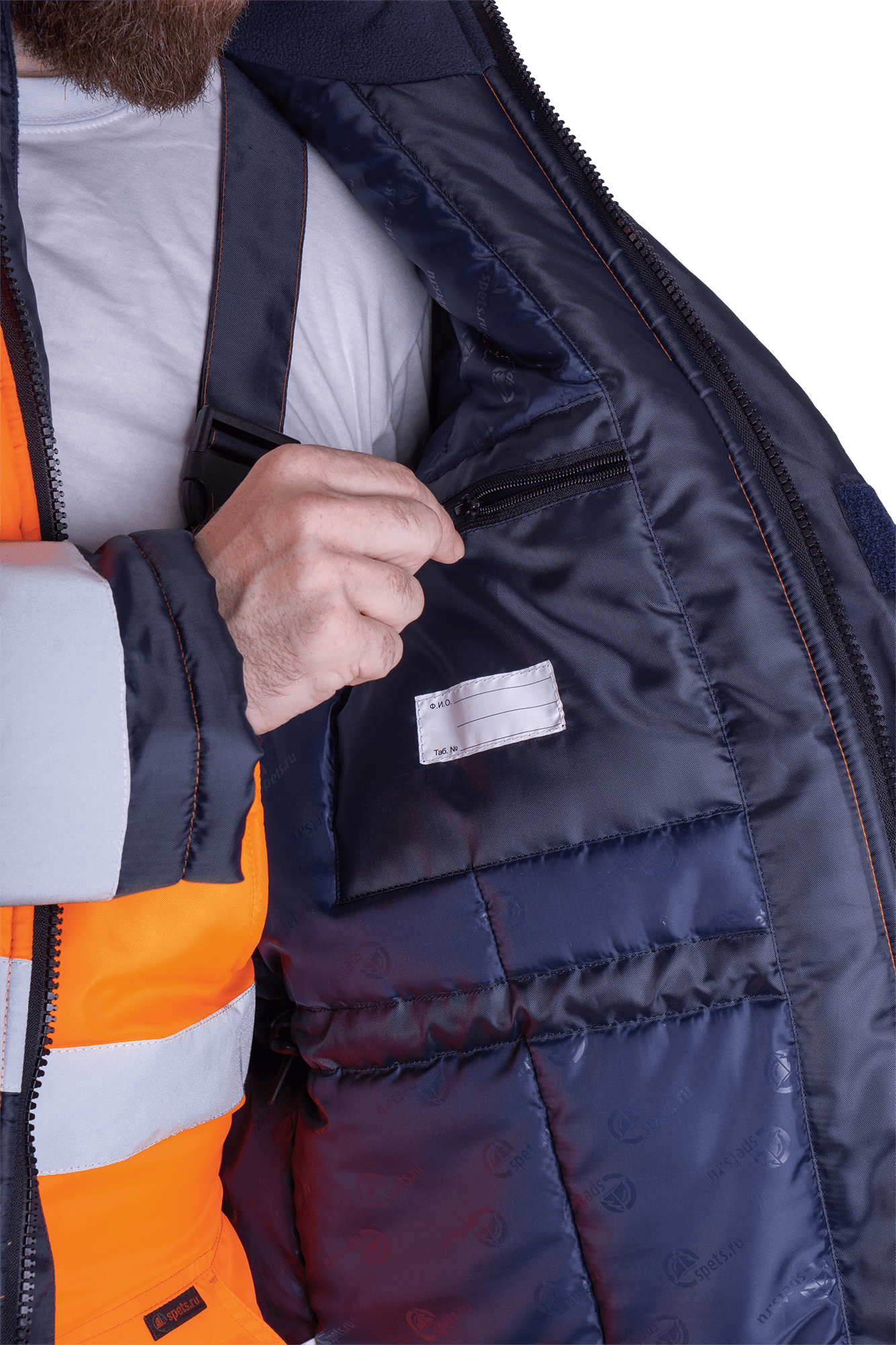 • капюшон утепленный с подбородочной частью, пристегивается на тесьму-молнию, с регулировкой