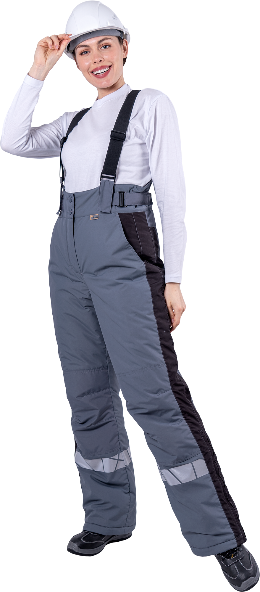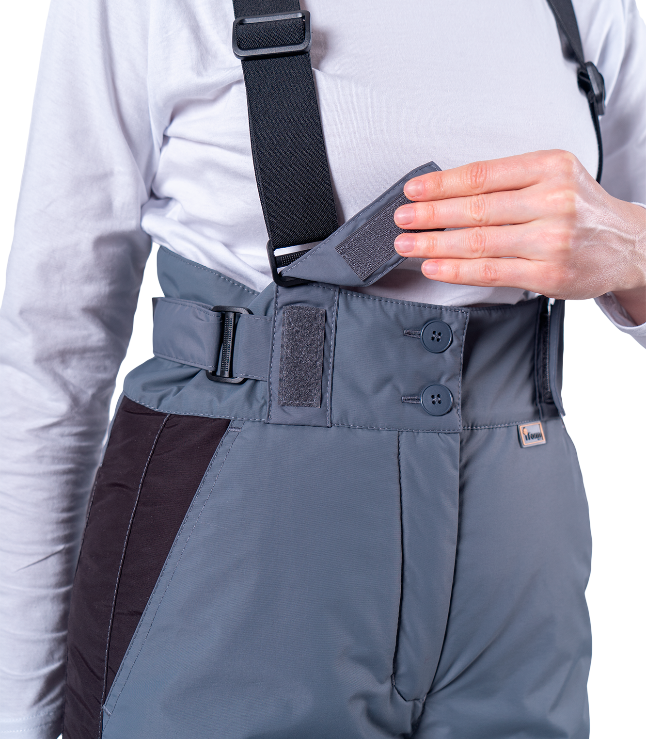 • высокий утеплённый пояс с застёжкой на две пуговицы. Объем пояса регулируется в области боковых швов с помощью хлястиков с застежкой текстильной и держателя с двухщелевой пряжкой