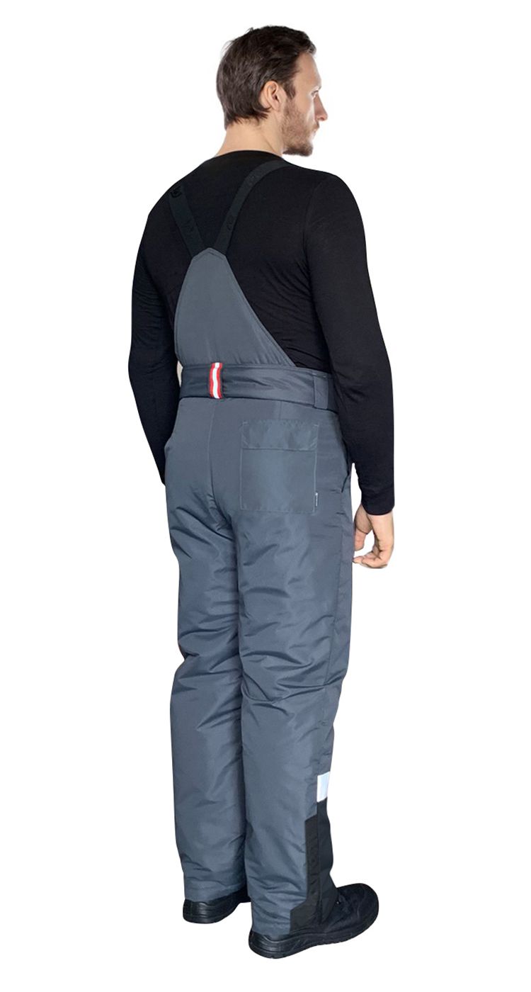 На передних половинках брюк расположены усилительные накладки в области коленей, детали из плотной, устойчивой к истиранию ткани в нижней части, разрезы на молнии под планкой, для удобства надевания на зимнюю обувь, и световозвращающие полосы для безопасности при работе в условиях плохой видимости. На задней правой половинке брюк расположен накладной карман под клапаном.