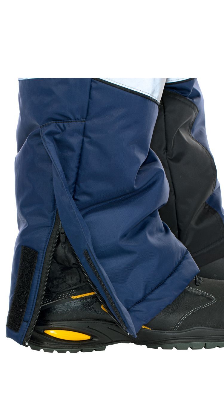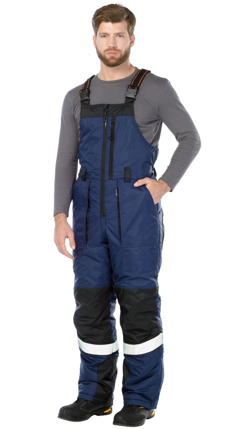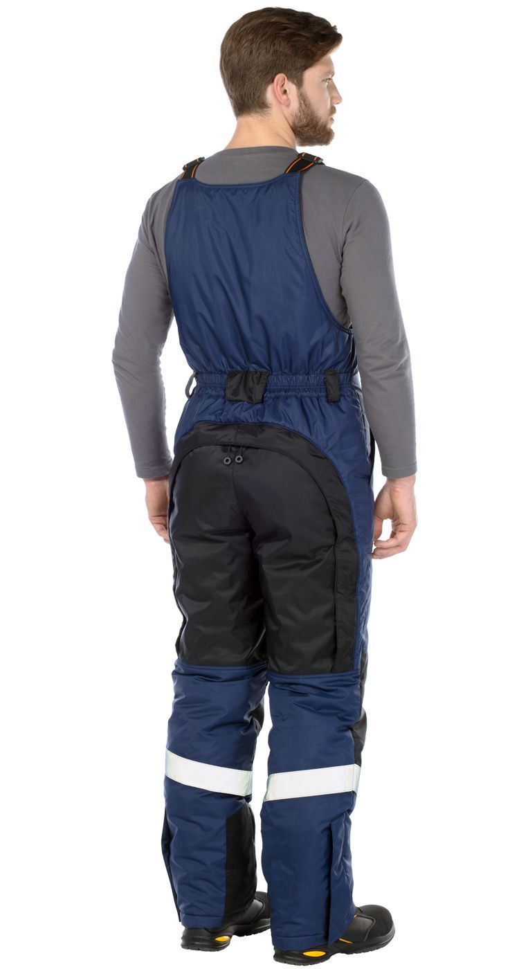 По низу брюк полукомбинезона расположены широкие световозвращающие полосы для безопасности при работе в условиях плохой видимости.