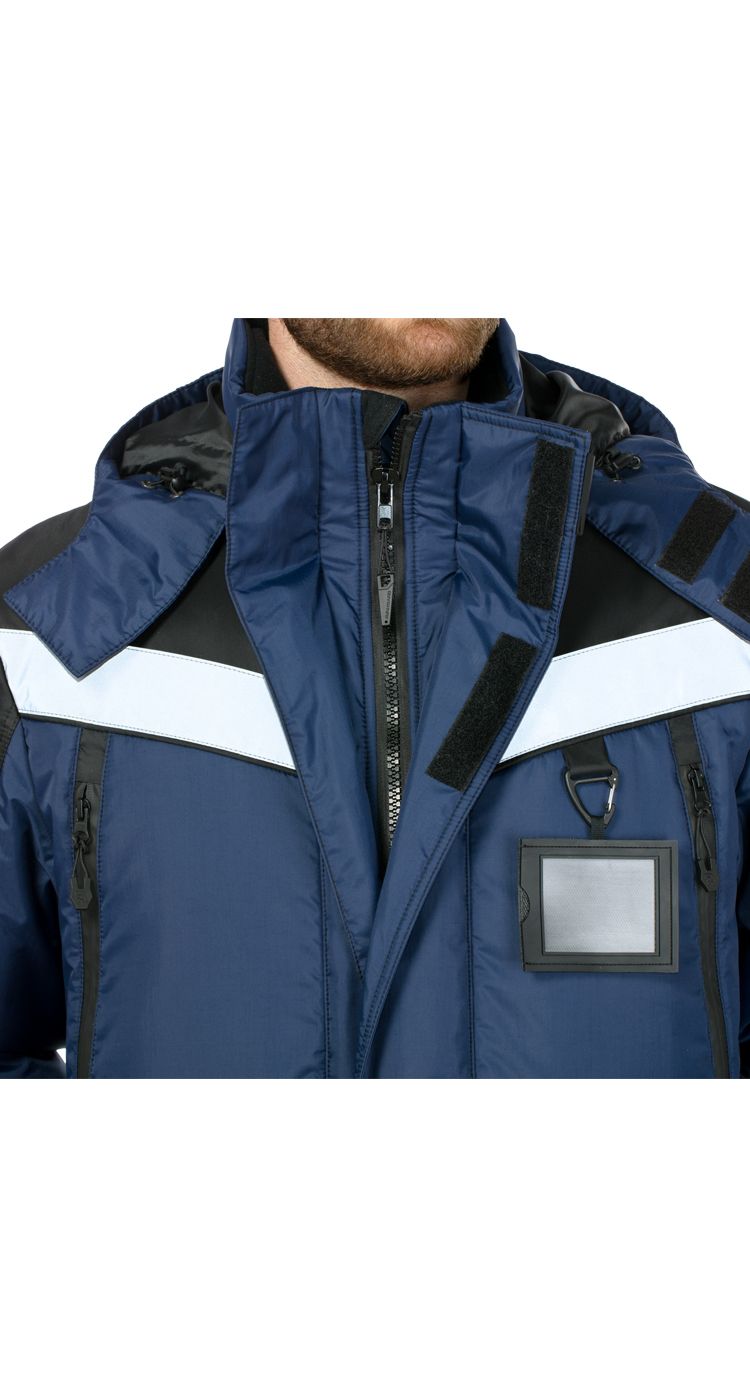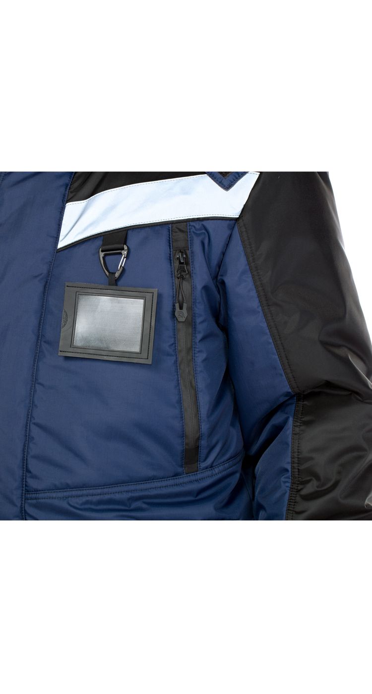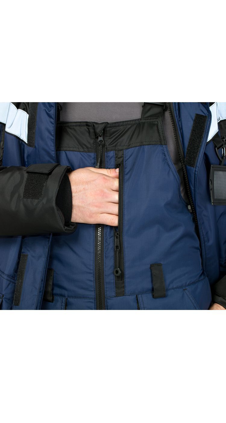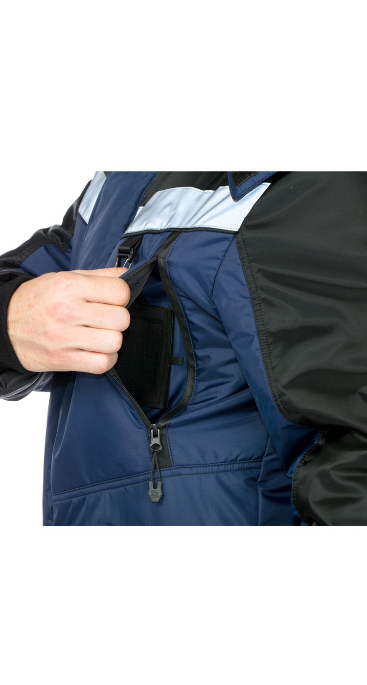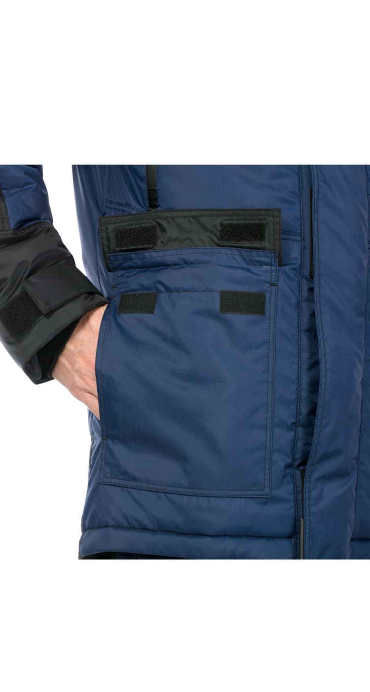 Верхние нагрудные утепленные карманы на прорезиненных водоотталкивающих молниях, защищающих содержимое от попадания влаги и снега.