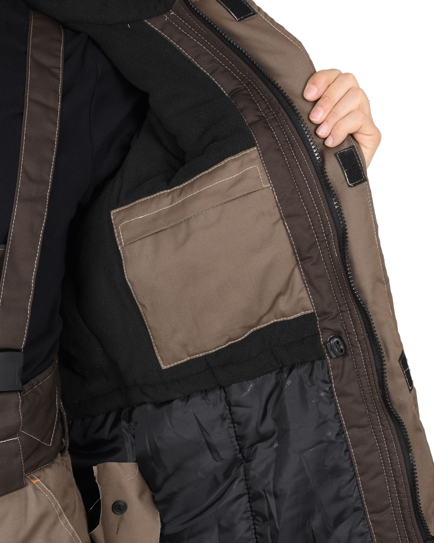 КУРТКА прямая длинная, с притачной утепленной подкладкой, с ветрозащитной прокладкой, с центральной застежкой на двухзамковую тесьму "молния". Внешняя ветрозащитная планка застегивается на потайные текстильные «липучки». Воротник стойка, с утепленным капюшоном пристегивающимся на тесьму «молния». Накладной функциональный нагрудный карман с клапаном; нагрудный карман в рамку на тесьму «молния». Нижние карманы в «листочку». Рукава втачные с притачной манжетой. СОП шириной 50мм для обеспечения видимости.
