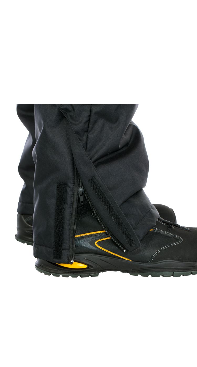 Застежка на гульфик с молнией и 2 кнопки с дополнительной потайной пуговицей на широком поясе, чтобы исключить его случайное расстегивание. Пояс брюк с регулировкой объема по талии при помощи хлястиков с липучками и пряжками. Спинка съемная, отстегивается при помощи молнии. Бретели из мягкой эластичной резинки пристегиваются к поясу брюк при помощи хлястиков с липучками и пряжек. По низу брюк - внутренние пуфты на липучке для защиты от случайного попадания снега внутрь обуви, а также разрезы с застежкой на молнию под планкой на липучке для удобства одевания зимней обуви.