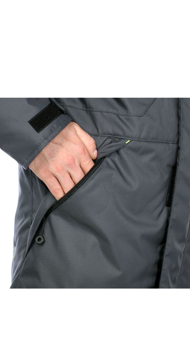 Куртка удлиненная, с центральной застежкой на молнию под ветрозащитной планкой на липучках. Вместительные нагрудные и нижние карманы на молниях, защищенные от попадания снега. Для обеспечения безопасности носителя в условиях плохой видимости на нагрудных карманах расположены световозвращающие полосы.