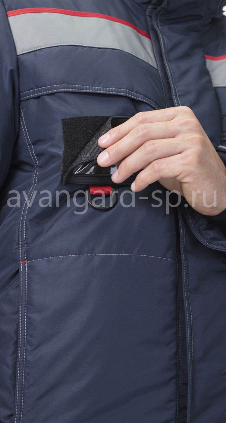 На правой полочке съемный чехол-окошко для бейджа и полукольцо для крепления пропуска.