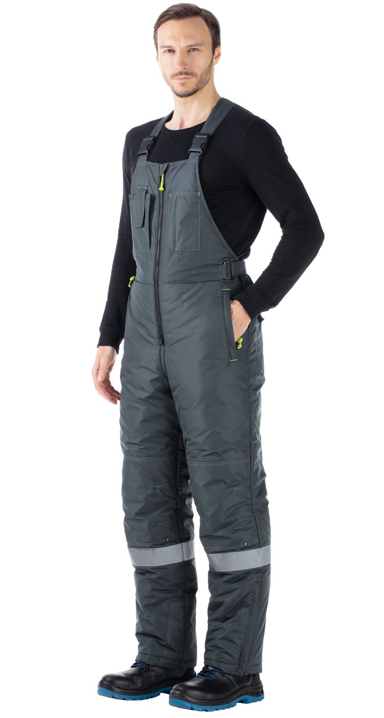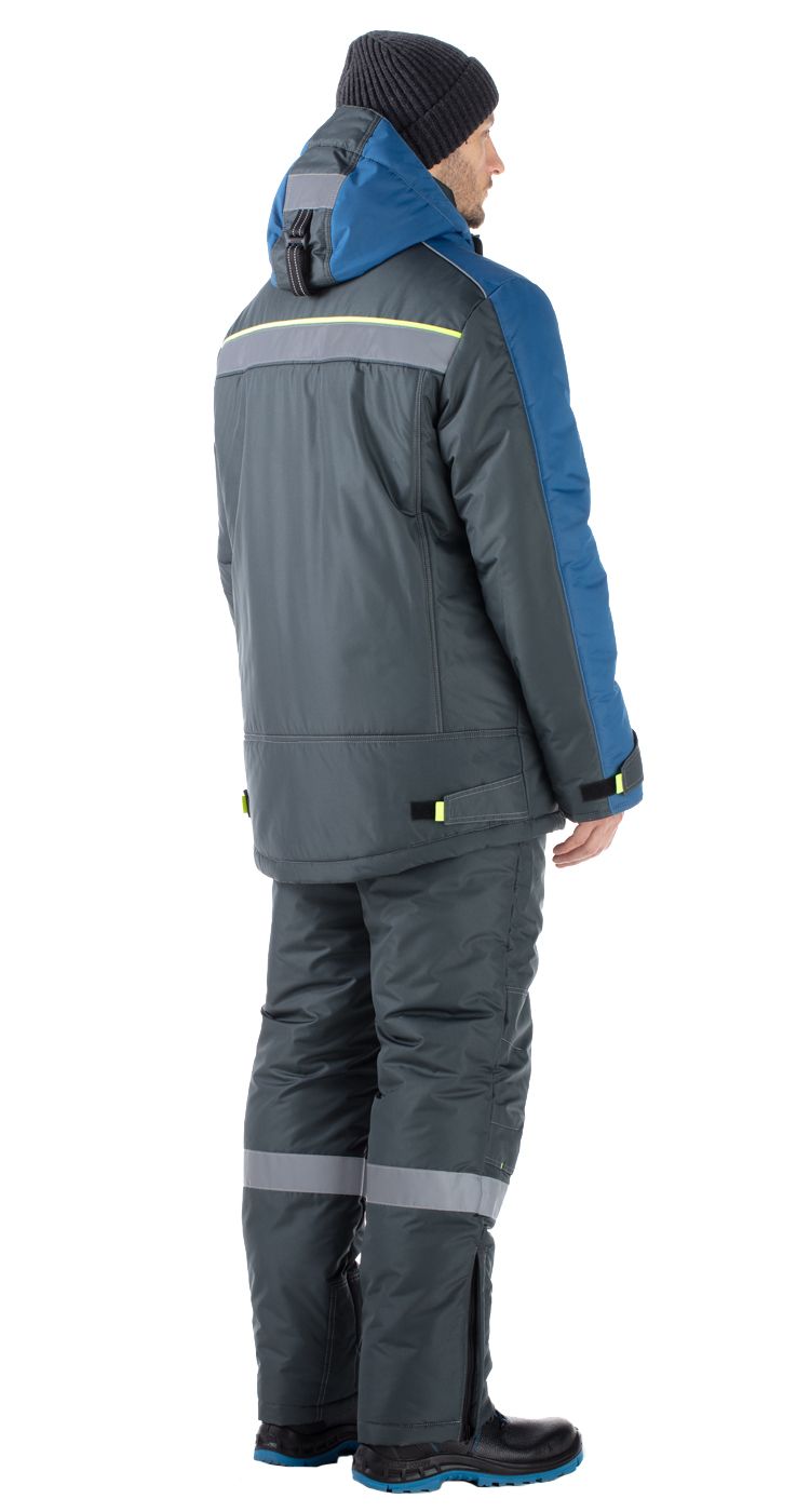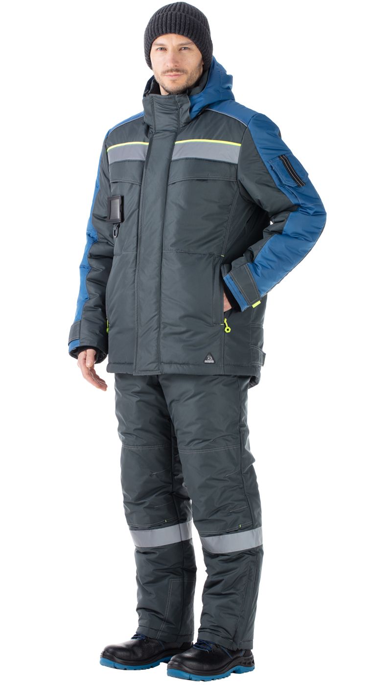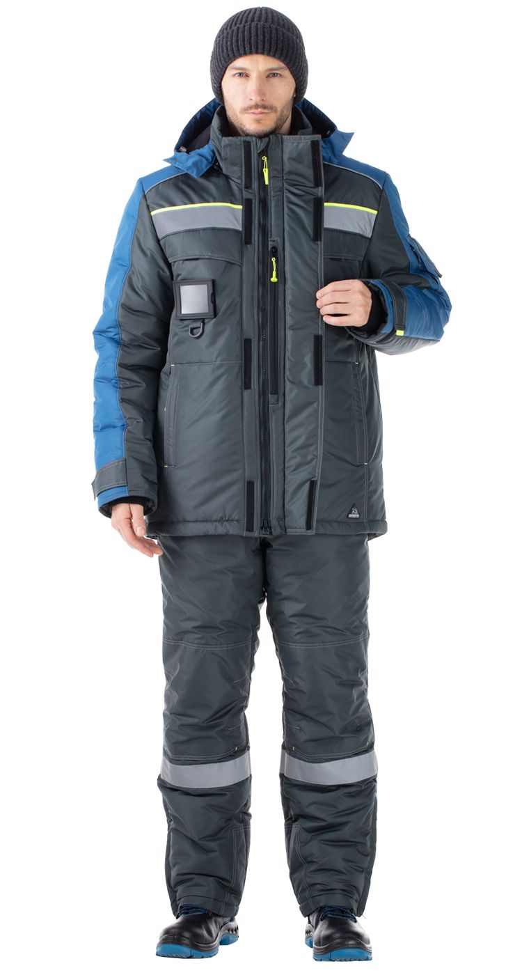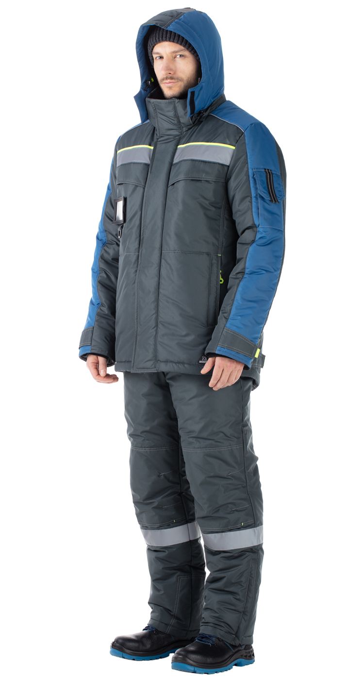 Костюм мужской утепленный, состоит из куртки и полукомбинезона из плотной курточной ткани с водоотталкивающими и ветрозащитными свойствами.