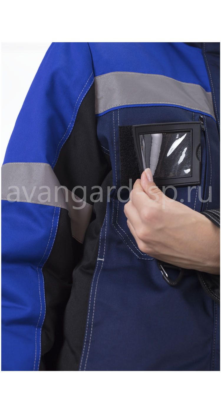 На куртке и по низу полукомбинезона – широкие световозвращающие полосы для работы в условиях плохой видимости.