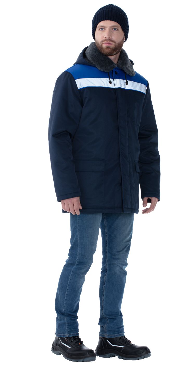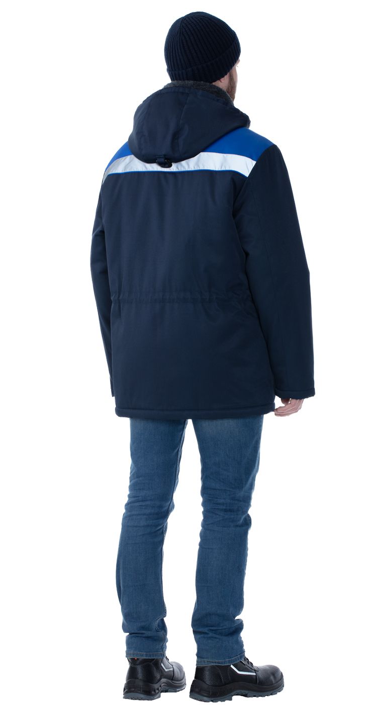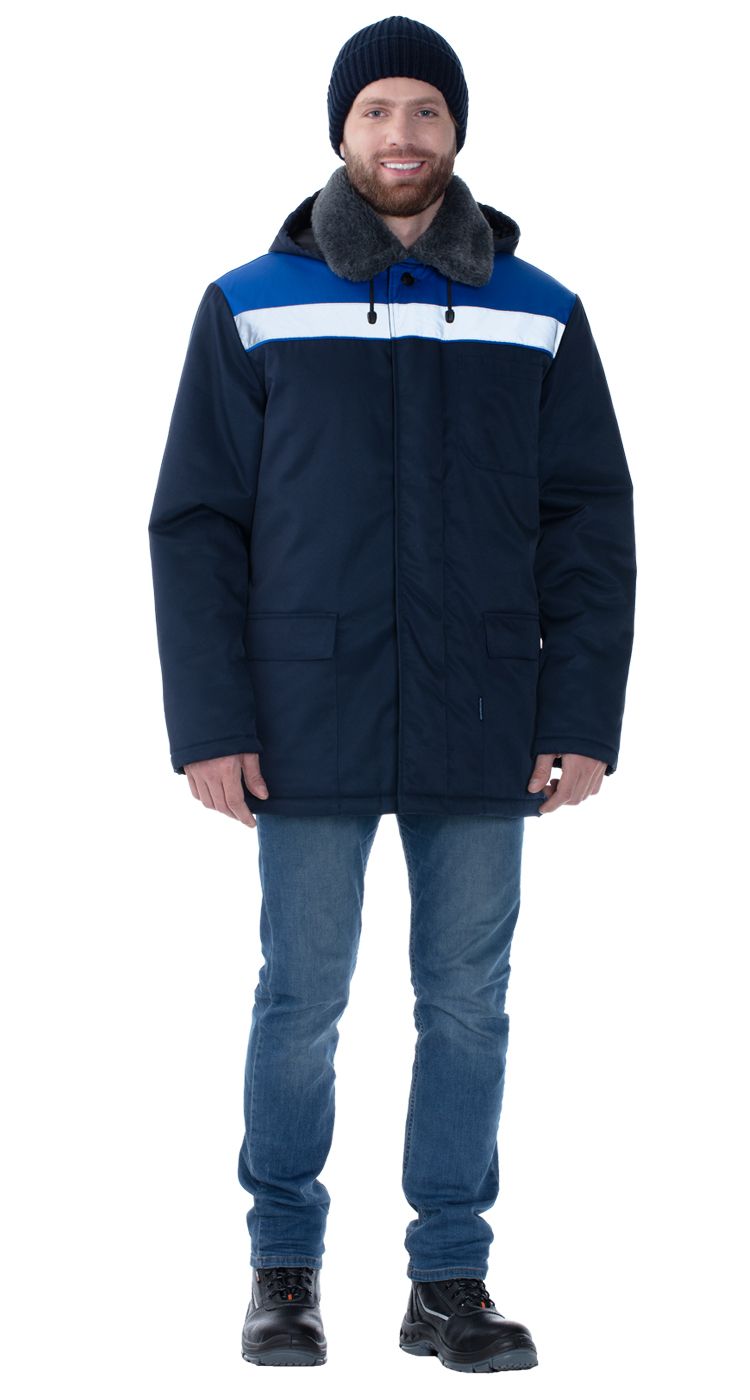 Куртка мужская утепленная с контрастной кокеткой, с кулисой по талии для регулировки объема. Супатная центальная застежка на пуговицах. Воротник отложной с искусственным мехом.