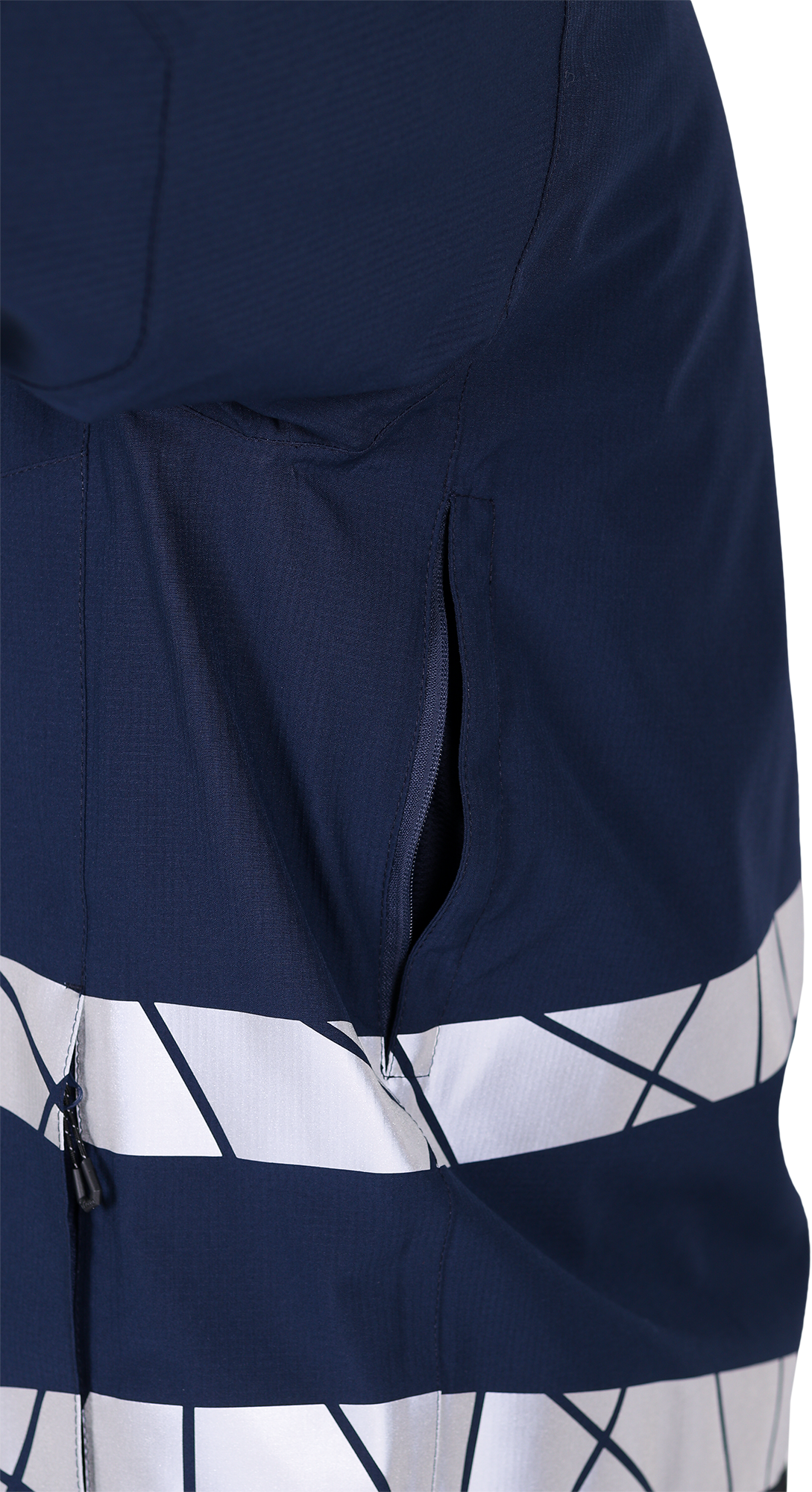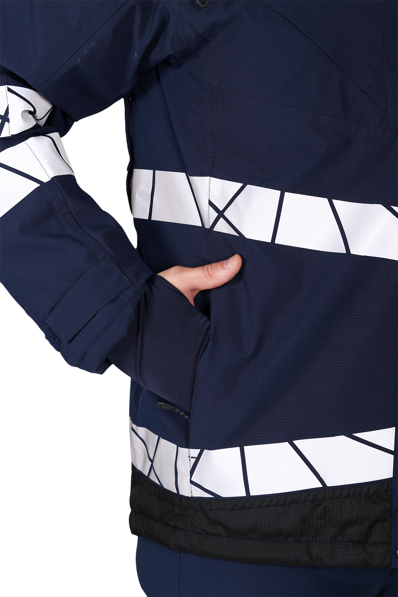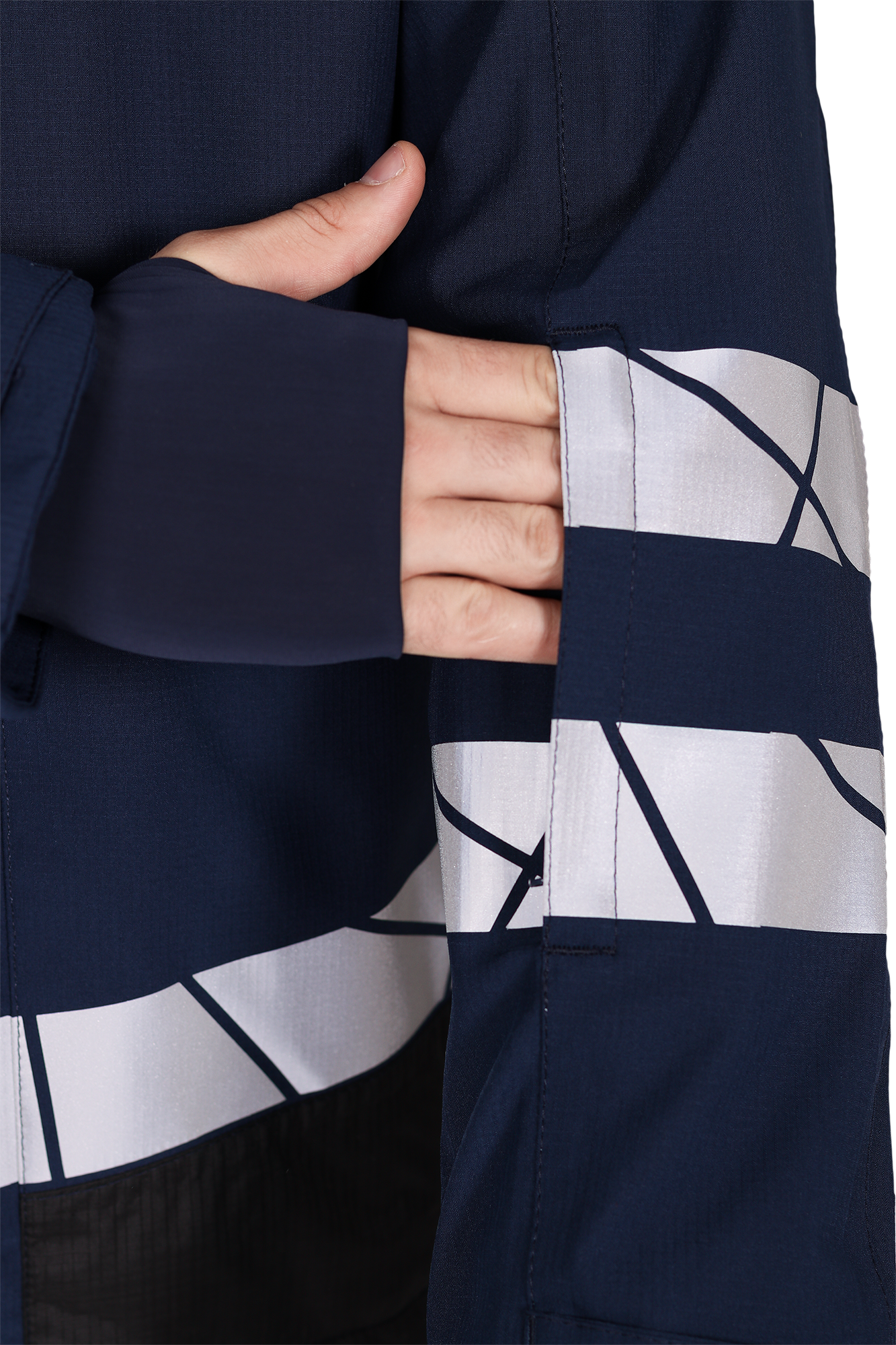 • две охватывающие термолкеевые световозвращающие полосы шириной 50 мм по торсу куртки и рукавам