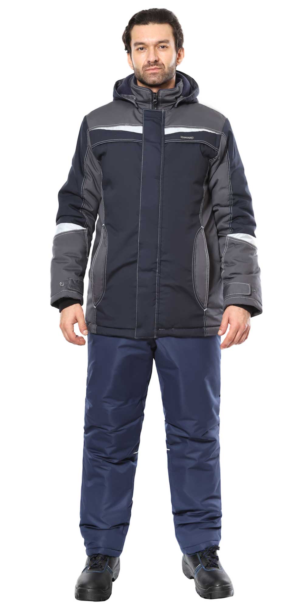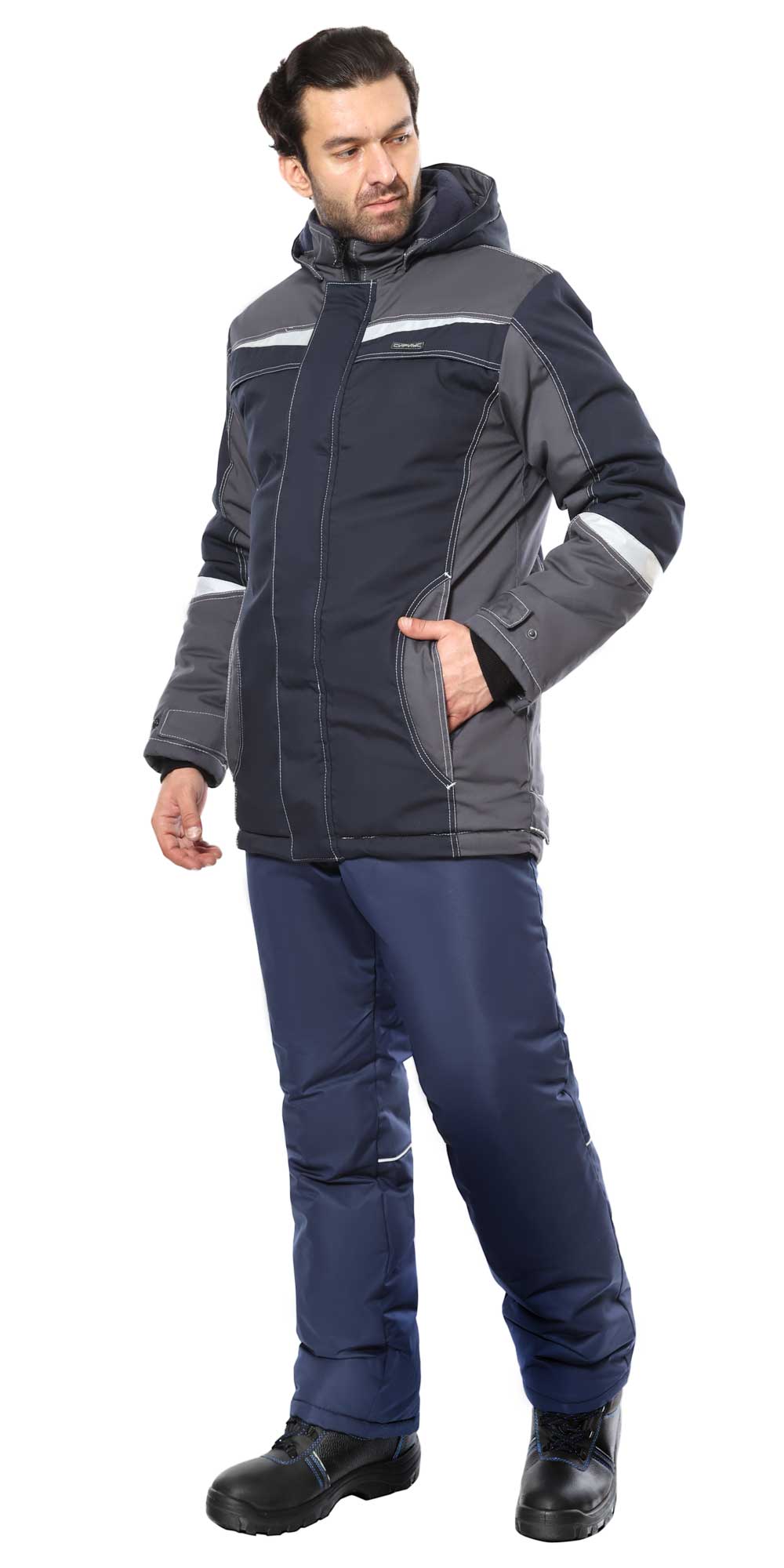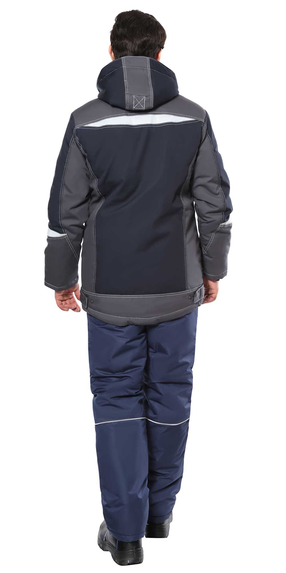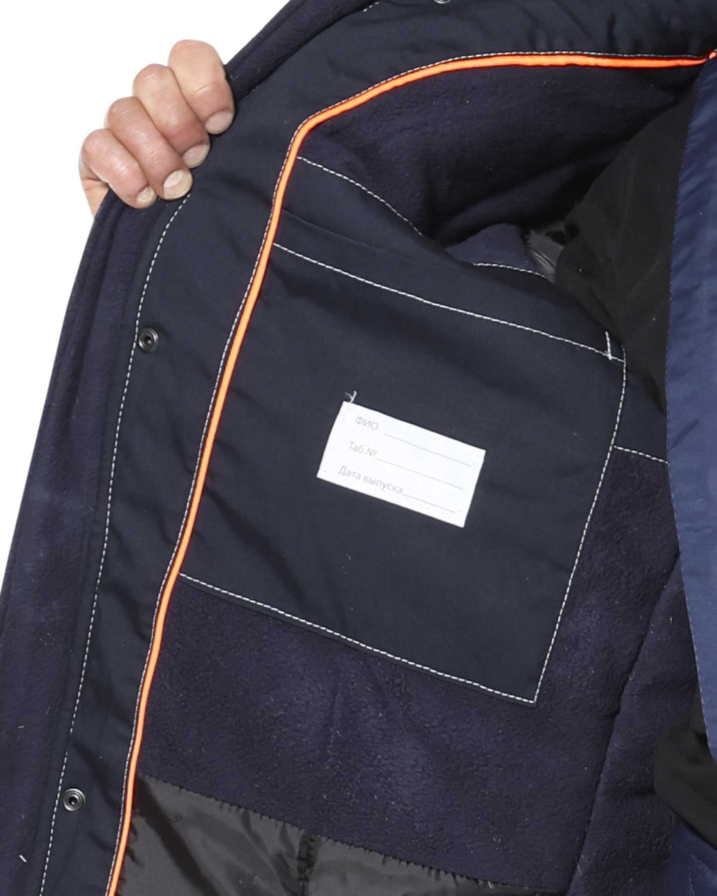 Куртка прямого силуэта, удлиненная, с воротником стойка, с центральной застёжкой на молнию, которая закрыта ветрозащитным клапаном с потайными кнопками. Куртка с верхними и нижними скрытыми прорезными карманами на молнию, с внутренним карманом на молнии с левой стороны от застежки под ветрозащитным клапаном. Спинка понизу фигурная, удлиненная, по боковым сторонам с хлястиками для регулировки прилегания. Рукава втачные, разрезные, с трикотажными манжетами, ширина внизу регулируется хлястиками с потайными кнопками. Внутренний воротник из флиса. Куртка со съемным капюшоном, который пристегивается к горловине куртки с помощью кнопок. Подкладка куртки утепленная, комбинированная: верхняя часть из Флиса, нижняя часть из ткани Таффета. На подкладке куртки с правой стороны накладной карман.