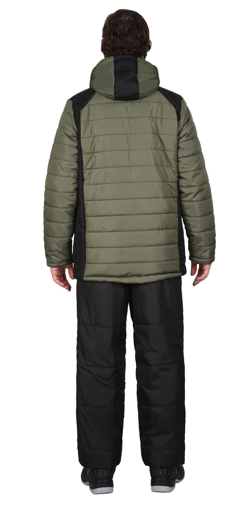 Куртка комбинированная из ткани двух цветов, с центральной застежкой на молнию, с удлиненной фигурной линией низа по спинке, с втачным капюшоном, с втачными рукавами. Куртка с левым нагрудным прорезным карманом на молнию, нижние карманы в швах. На подкладке с правой стороны накладной карман на молнию.
