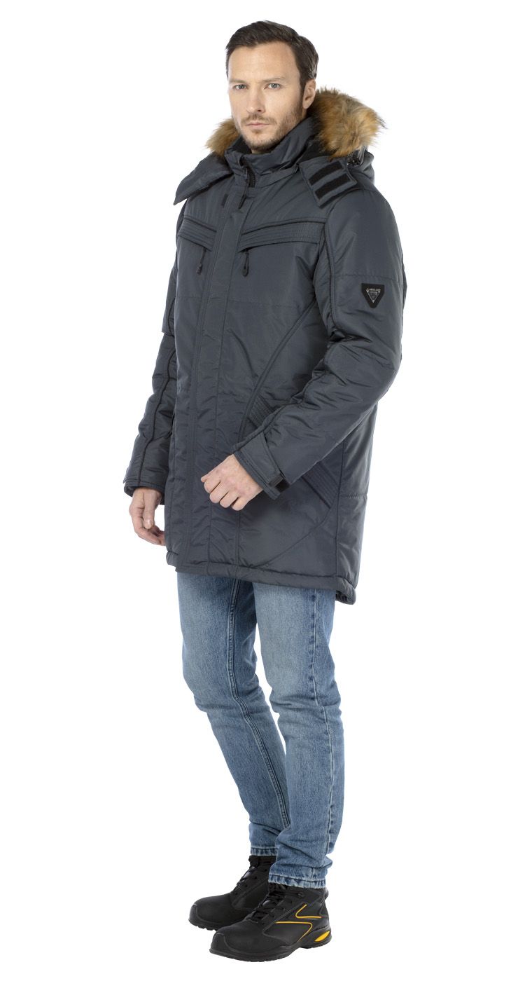 Капюшон съемный, на молнии, с двойной регулировкой объема по лицевому вырезу и по затылочной части. Съемная опушка на капюшоне из искусственного меха.