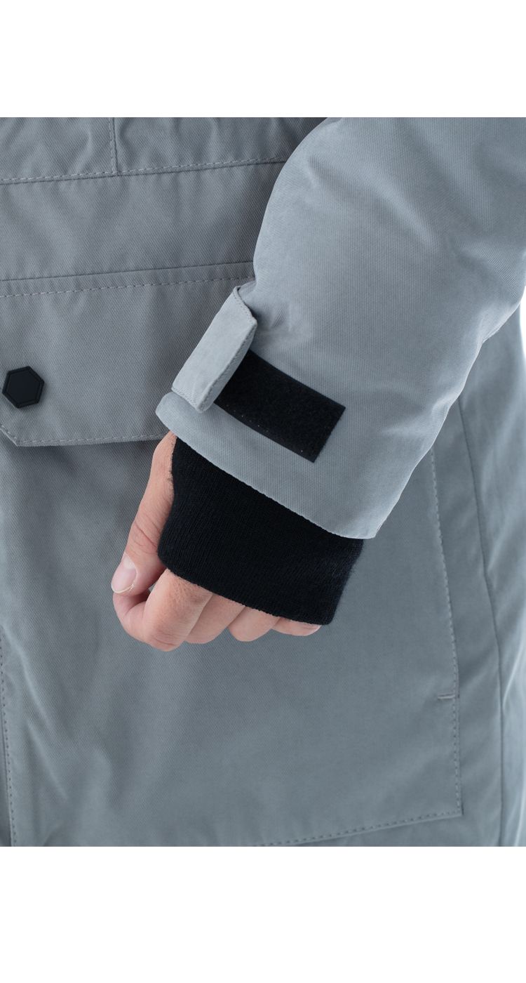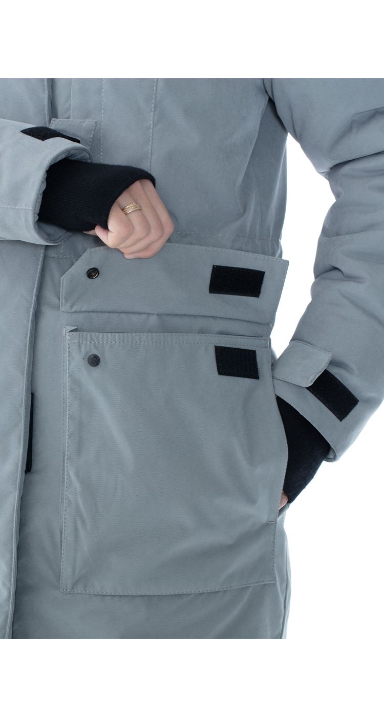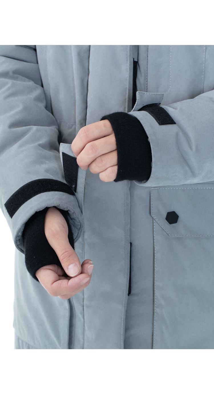 Куртка удлиненная, с центральной застежкой на двухзамковую молнию под ветрозащитной планкой на липучках.