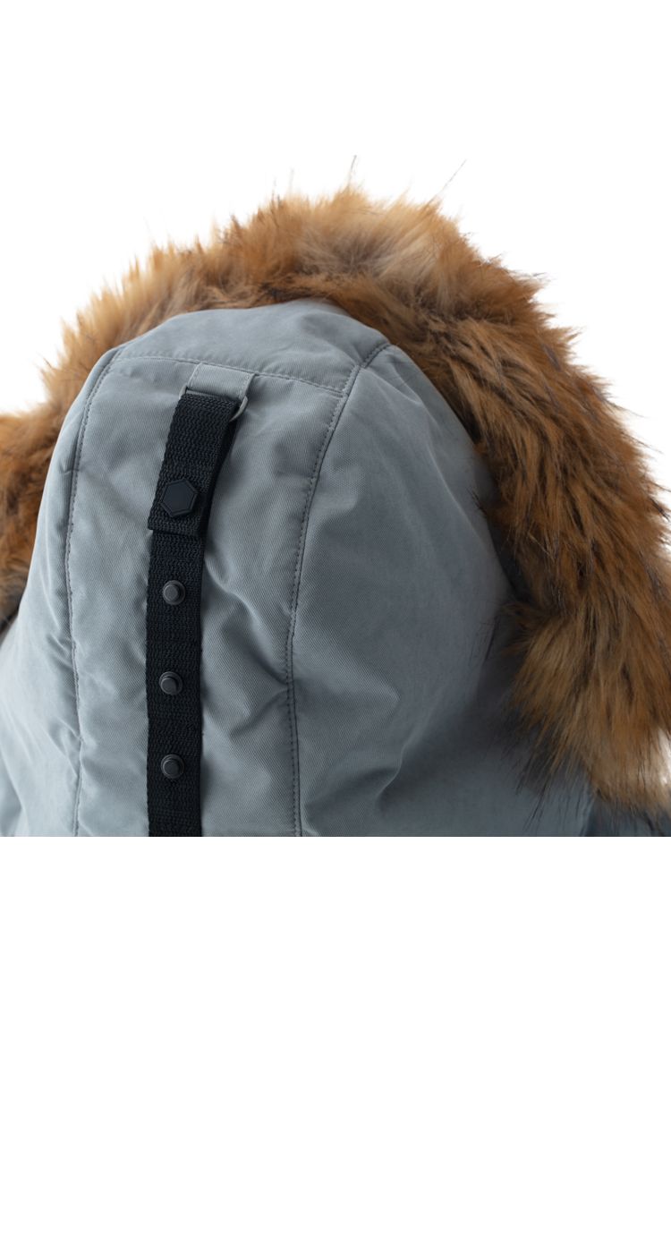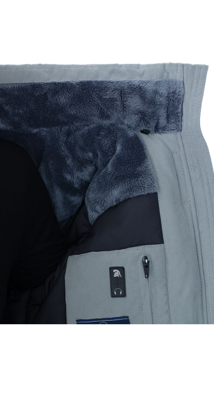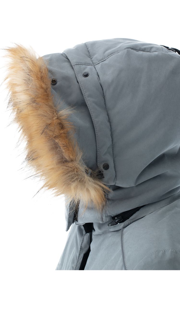 Капюшон съемный, на молнии, с двойной регулировкой объема по лицевому вырезу и по затылочной части на тесьму и кнопки. Съемная опушка на капюшоне из искусственного меха. Возможность увеличить глубину капюшона за счет отворота для защиты от метели и ветра.
