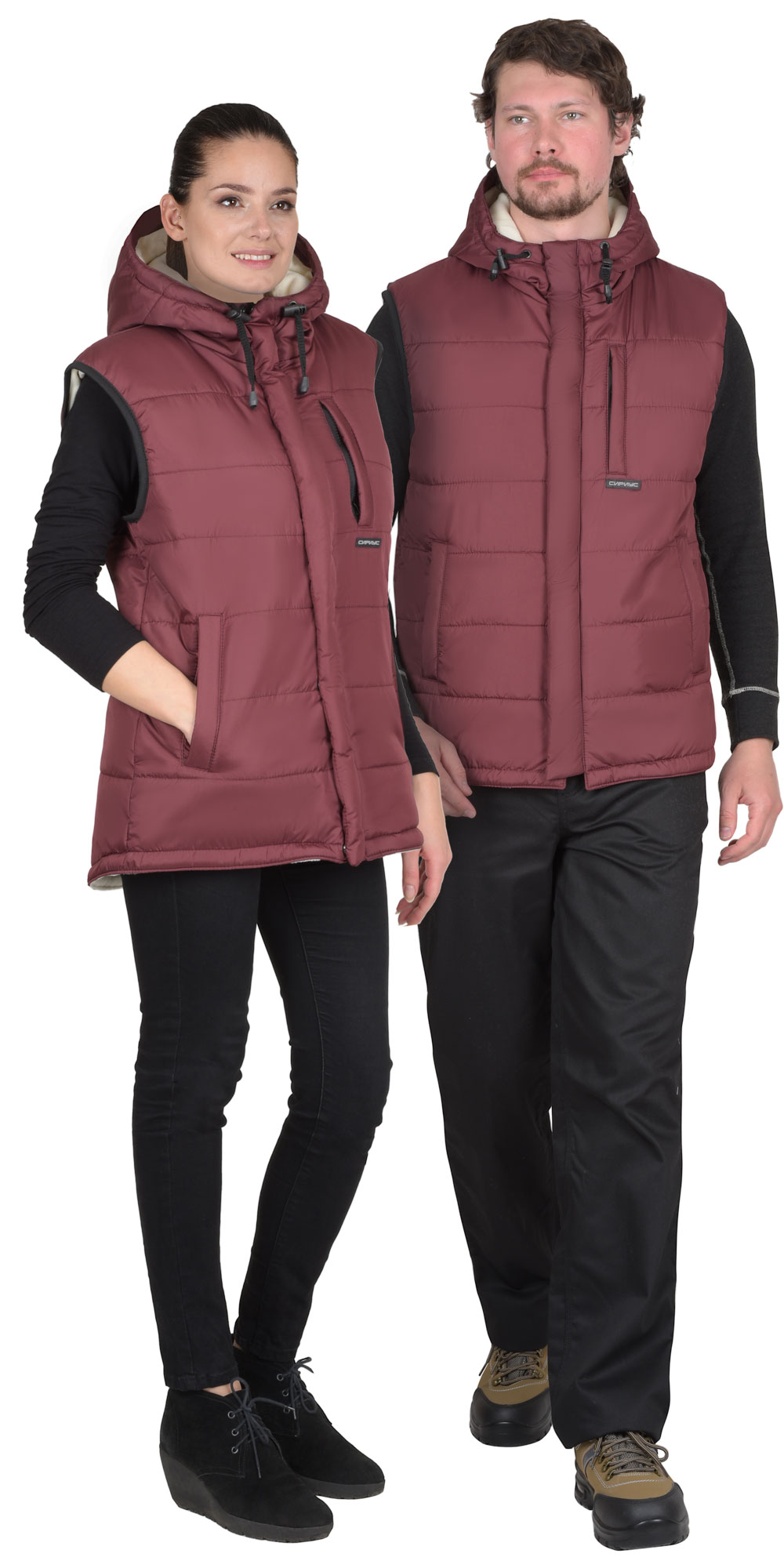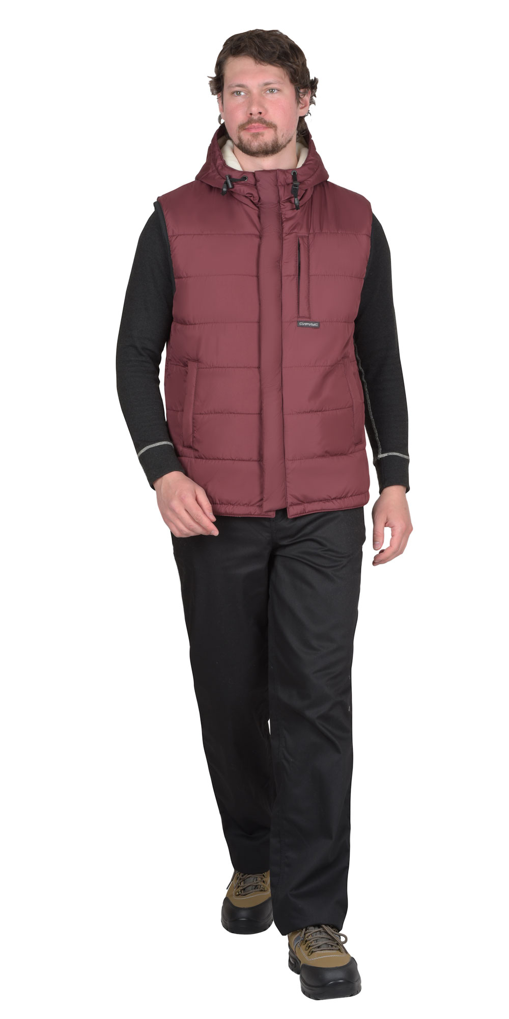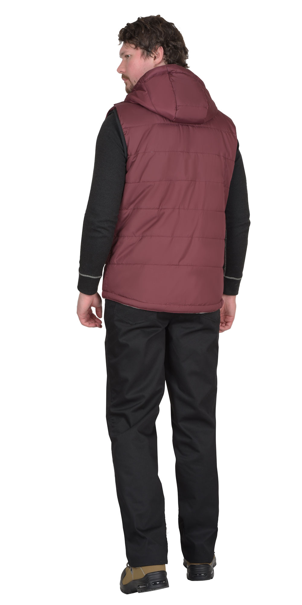 Жилет утеплённый, выстеган с утеплителем горизонтальными строчками, с флисовой подкладкой контрастного цвета, с втачным капюшоном, с застёжкой на молнию, прикрытую ветрозащитным клапаном от края капюшона до низа изделия, застёгивающимся на кнопки. Жилет с одним нагрудным карманом с молнией и двумя нижними карманами. Спинка жилета, удлинённая с фигурной линией низа. Пройма окантована резинкой. Объём капюшона по лицевому вырезу регулируется шнуром с фиксаторами.