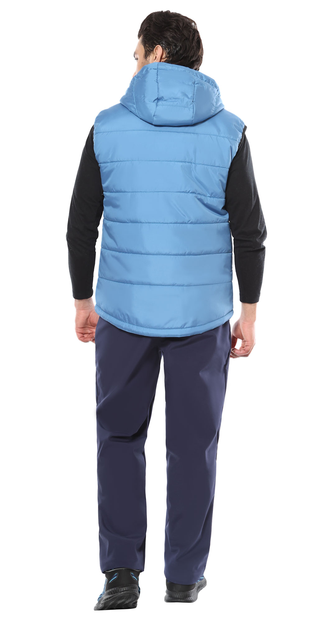 Жилет утеплённый, выстеган с утеплителем горизонтальными строчками, на подкладке, с втачным капюшоном, с застёжкой на молнию, закрытую ветрозащитным клапаном от края капюшона до низа изделия, застёгивающимся на кнопки. Жилет с одним нагрудным карманом с молнией и двумя нижними карманами. Спинка жилета, удлинённая с фигурной линией низа. Пройма окантована резинкой. Объём капюшона по лицевому вырезу регулируется шнуром с фиксаторами.