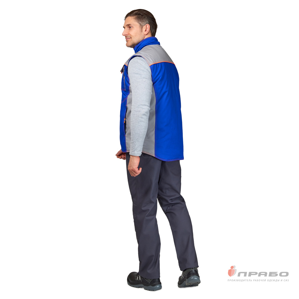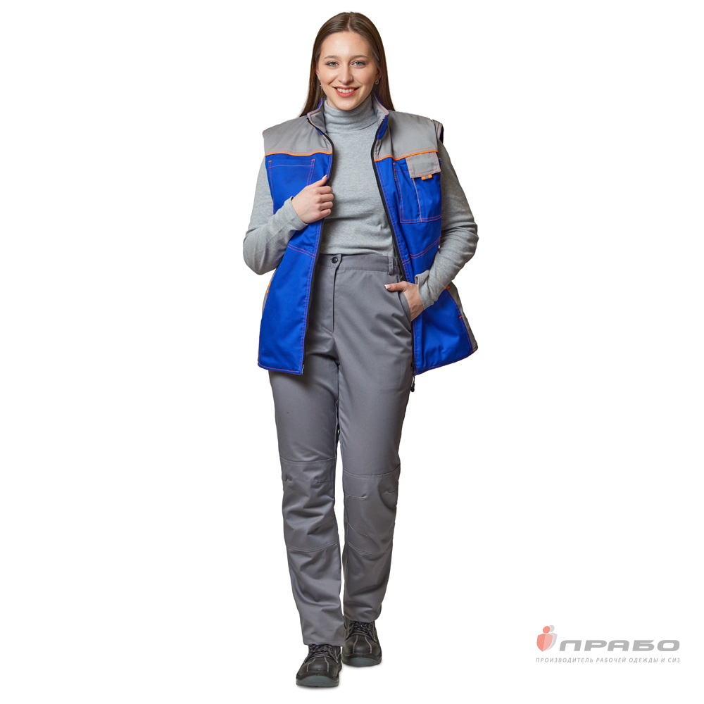 Жилет: утеплённый прямого силуэта, с центральной застёжкой на тесьму «молнию». Полочка состоит из трёх частей: центральная часть из ткани основного цвета, кокетки и боковые части из отделочной ткани. Спинка жилета удлинённая, фигурная. Воротник–стойка утеплённый. Утепляющая подкладка жилета стёганная вертикальными строчками. На левой полочке подкладки настрочена лента ФИО.