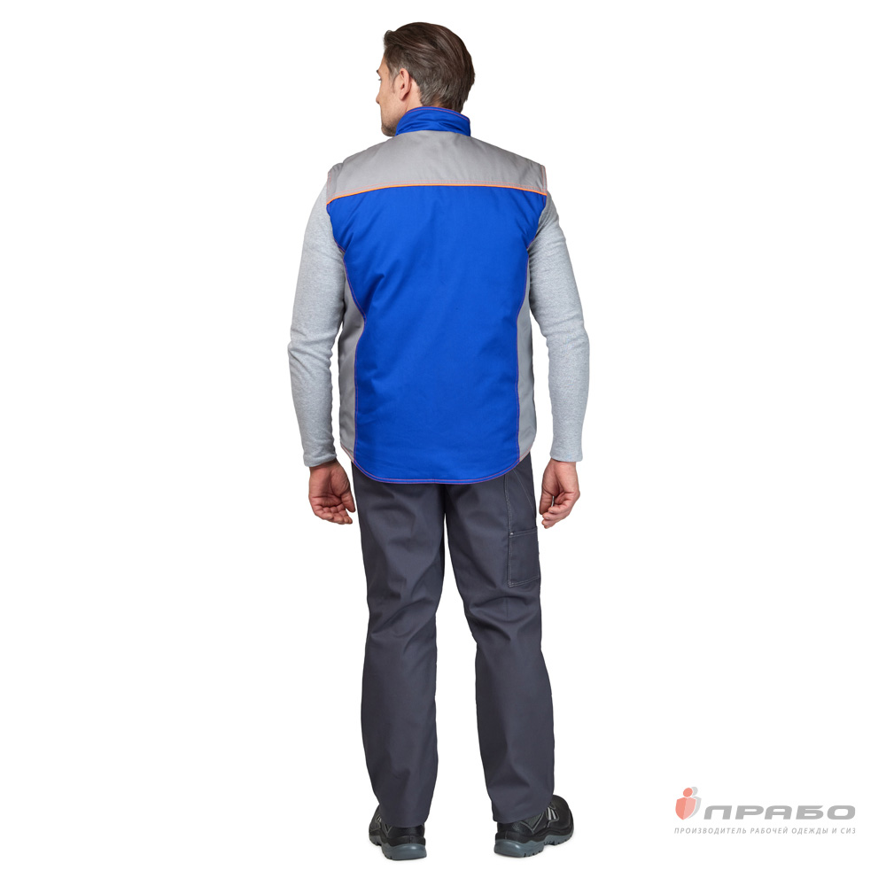 • выполнен из ткани двух цветов - серого и василькового, с ярким кантом и отделочными патами на карманах;