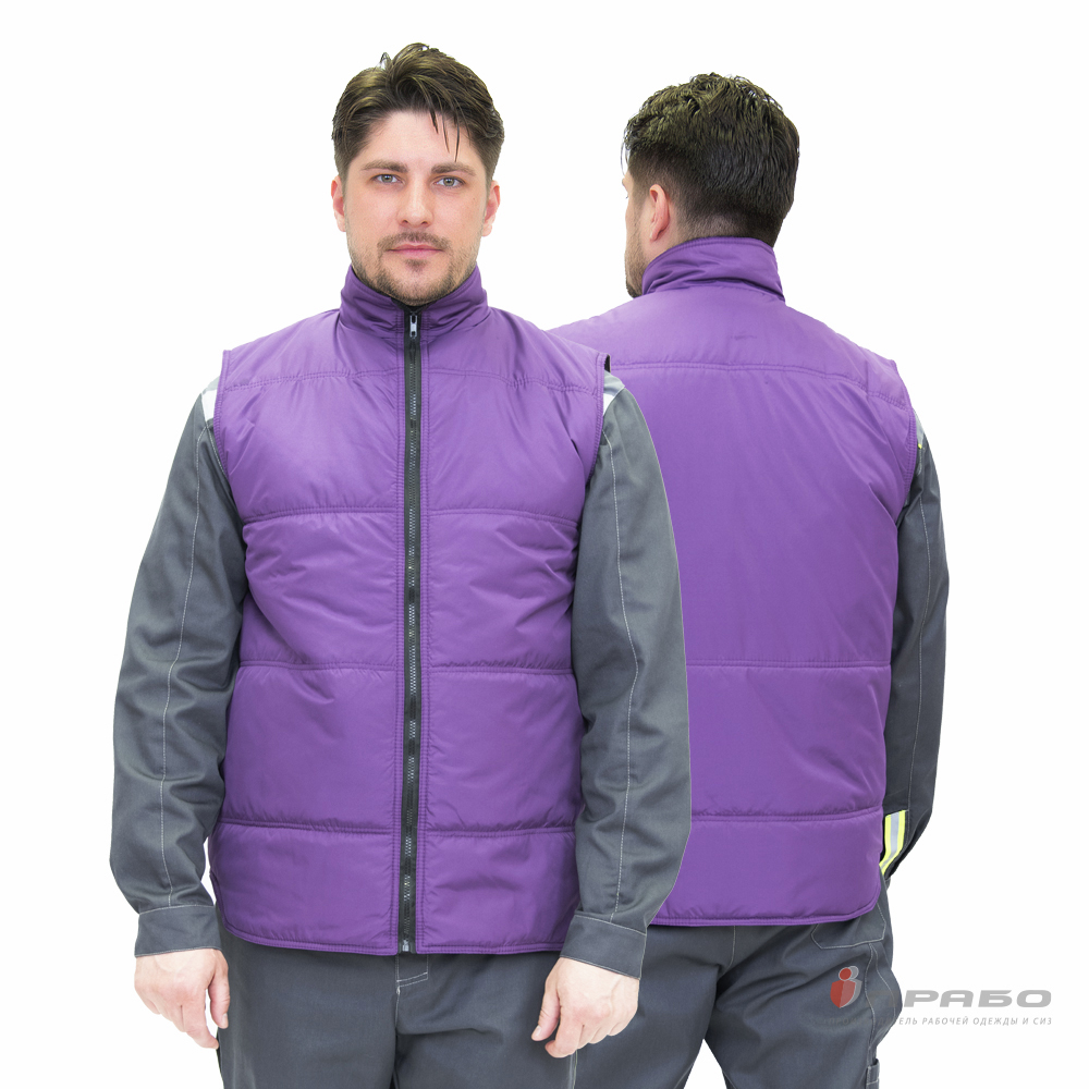Жилет: утеплённый, прямого силуэта с горизонтальной стёжкой по полочкам и спинке, с центральной застёжкой на молнию. Спинка жилета удлинённая с фигурной линией низа. Воротник-стойка.