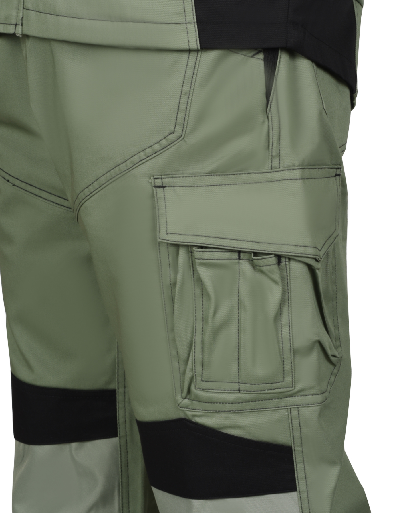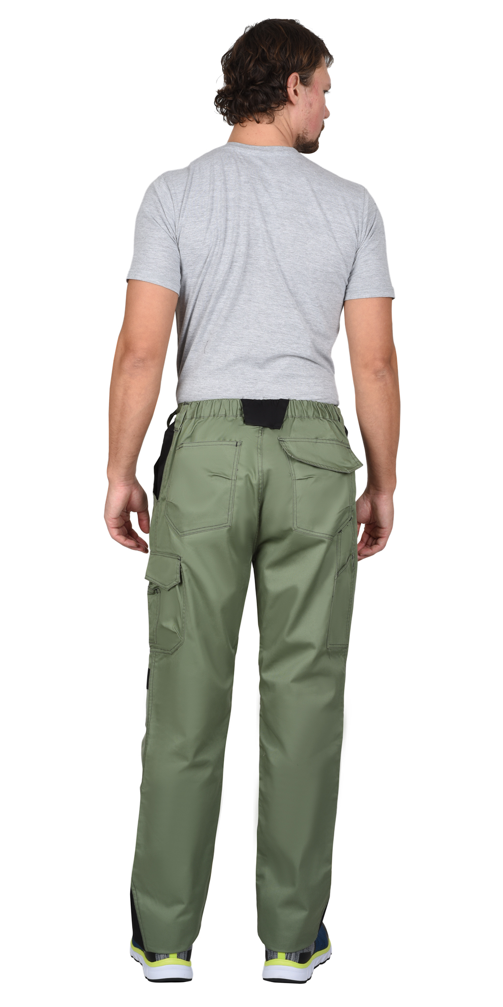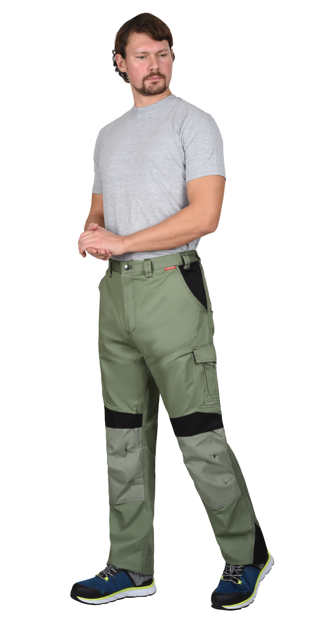Брюки прямые с застёжкой спереди - гульфик с молнией, с отрезным поясом, с карманами спереди, сзади и на боковых швах, с объёмными наколенниками из плотной, полиэфирной, непромокаемой ткани с верхним входом для амортизационного вкладыша.