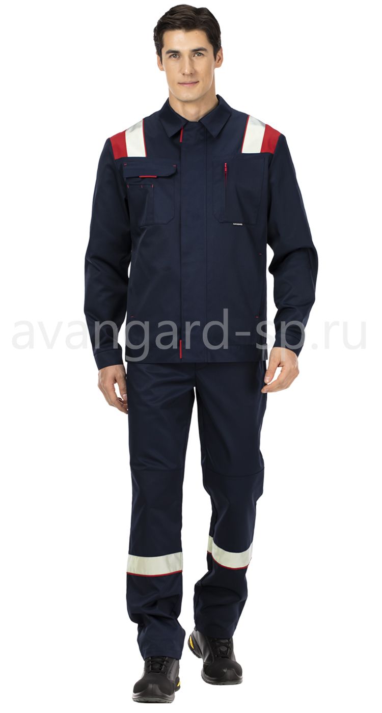 Нагрудные накладные карманы: один - с клапаном и отделениями для ручек, второй карман на молнии для персональных документов. Нижние карманы в рельефных швах. На кокетках спереди и на спинке контрастные вставки с вертикальными широкими световозвращающими полосами для безопасности при работе в условиях плохой видимости.