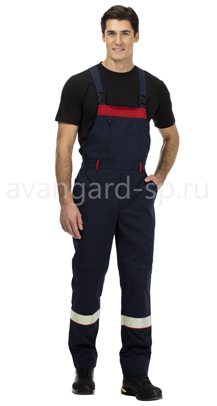 Полукомбинезон с гульфиком на молнии. Бретели с регулировкой длины и с застежкой на фастексы. На грудке расположен вместительный карман на молнии с отделениями для ручек. На передних половинках - верхние карманы с боковым входом. На спинке - эластичная тесьма для регулировки объема по талии. Сзади - накладные карманы. На поясе - шлевки контрастного цвета. По низу брюк полукомбинезона расположены широкие световозвращающие полосы для безопасности при работе в условиях плохой видимости с контрастным кантом под ними.