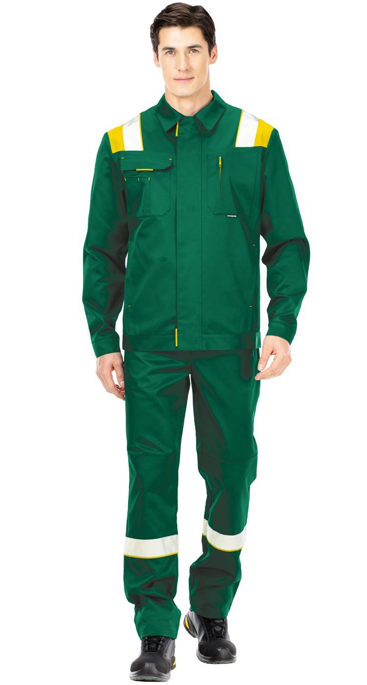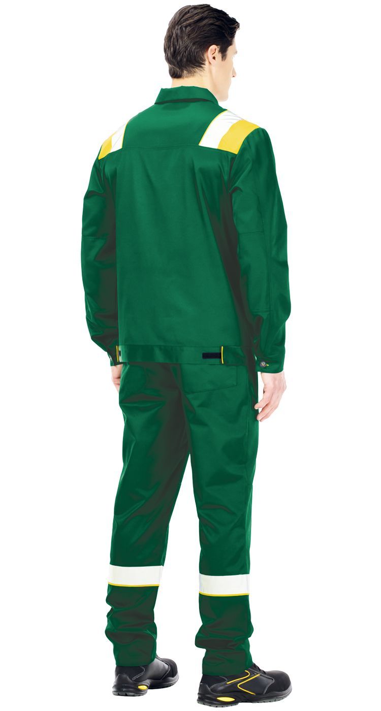 Нагрудные накладные карманы: один - с клапаном и отделениями для ручек, второй карман на молнии для персональных документов. Нижние карманы в рельефных швах. На кокетках спереди и на спинке контрастные вставки с вертикальными широкими световозвращающими полосами для безопасности при работе в условиях плохой видимости.