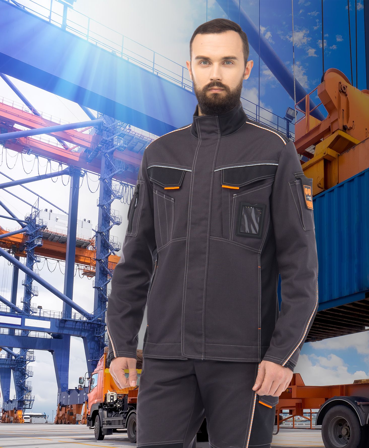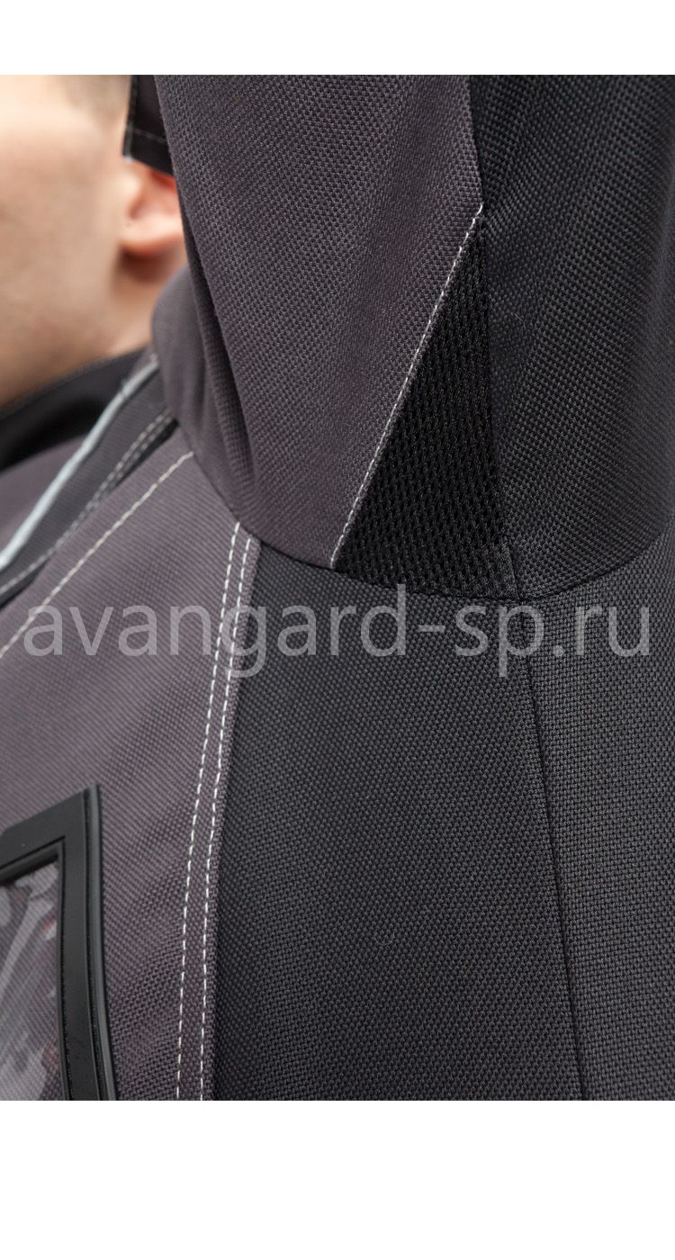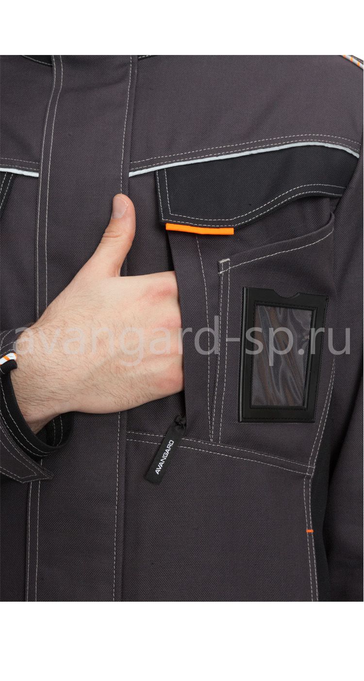 Куртка удлиненная с застежкой на молнию под планкой на липучках. Многофункциональные нагрудные карманы, в том числе с клапанами, на молнии, с отделениями ручек, ПВХ карман для бэйджа. Нижние карманы на молниях в швах. Спинка с кокеткой, отрезными боковыми частями и вентиляционными отверстиями в области лопаток с подкладкой из трикотажной сетки. Рукава втачные эргономичной формы, с вентиляционными вставками из сетки в нижней части проймы и с хлястиками на липучках по низу для регулировки объема. На левом рукаве - карман для средств связи с клапаном из стропы, с шевроном с защитными свойствами. На правом рукаве карман на молнии со съемным шевроном на липучке. Воротник стойка со световозвращающим трансфером в виде шлема. По низу куртки внутренняя кулиса для регулировки объема.
