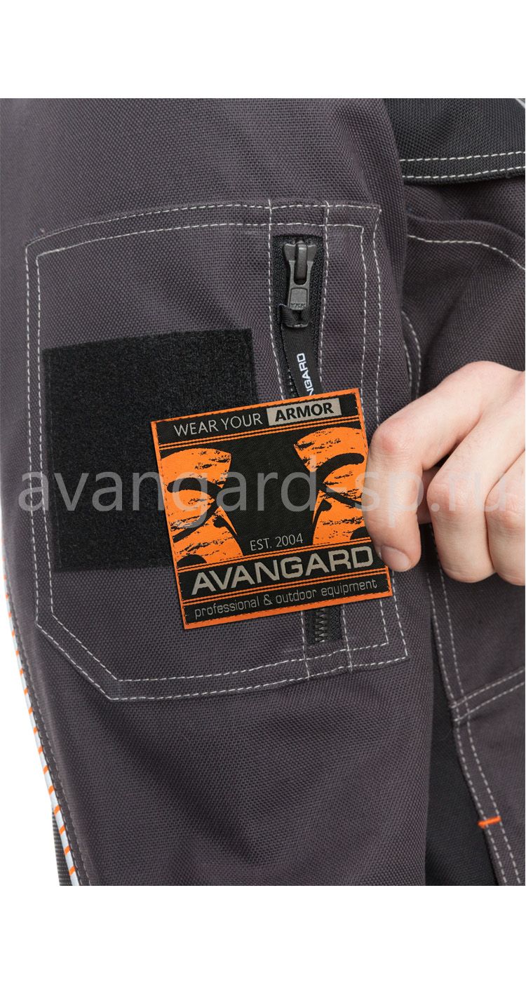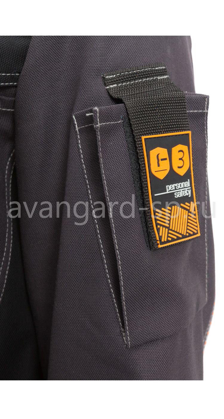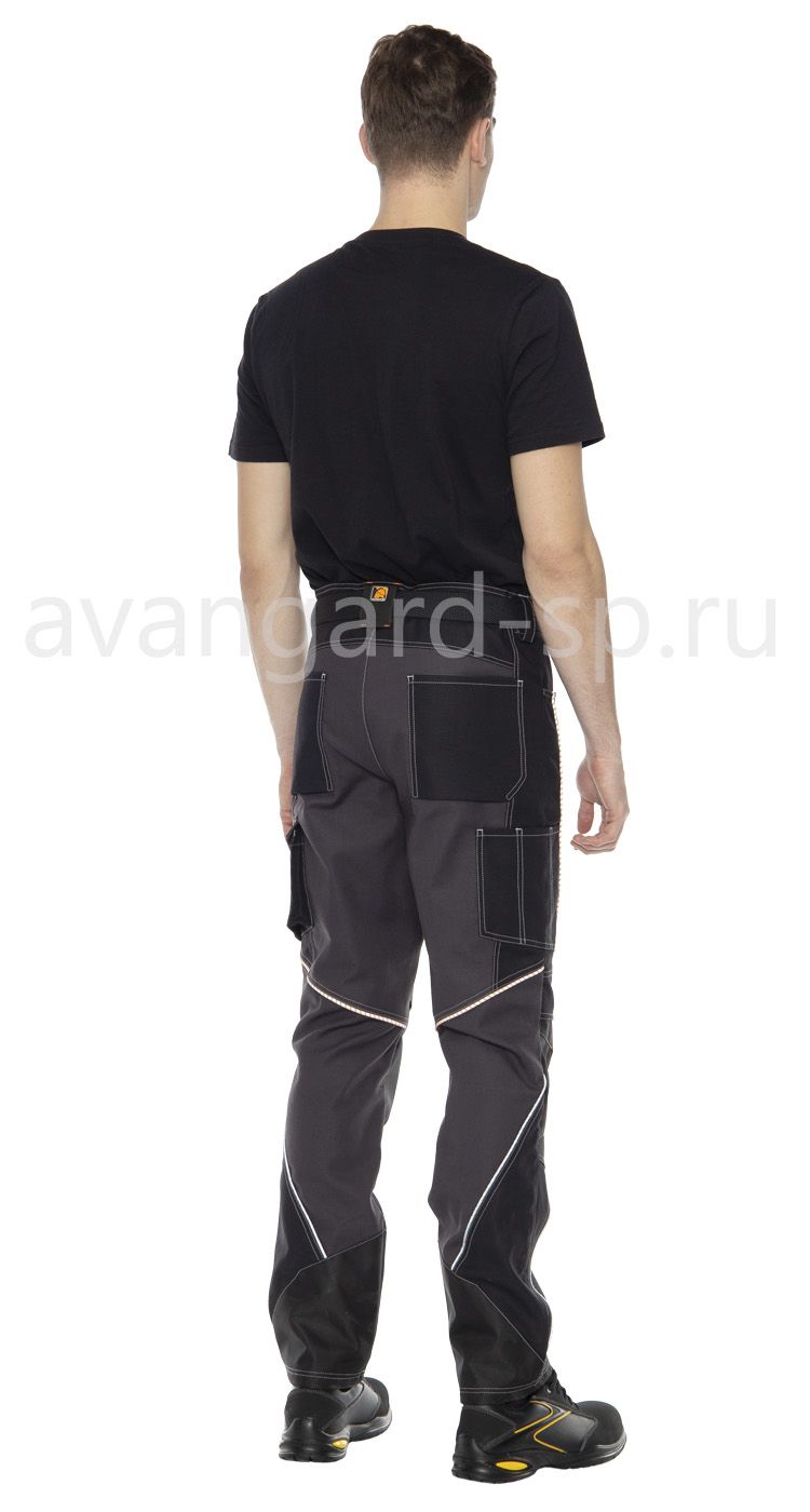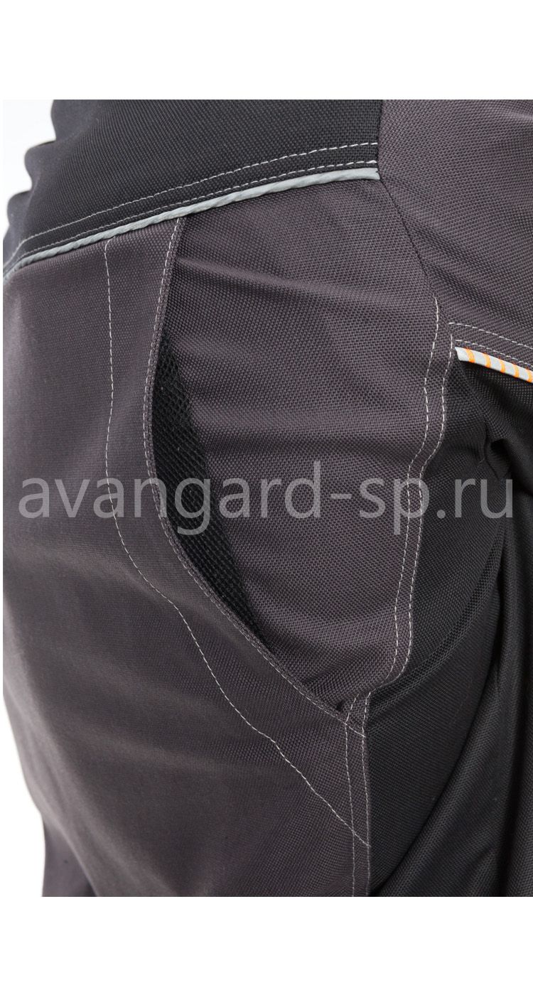Брюки эргономичной формы с застежкой на гульфик с молнией и пуговицу на поясе. Пояс со шлевками для фиксации ремня из стропы с застежкой и с пластиковой рамкой. На передних половинках верхние боковые карманы и карманы для амортизационных вкладышей в области колен. На задних половинках кокетки, вместительные верхние карманы. В области боковых швов брюк на уровне середины бедер расположены карманы с клапаном и для инструментов. Швы членений костюма подчеркнуты световозвращающими кантами двух цветов. В нижней части спинки и в области локтей куртки, а также в области колен и по низу брюк накладки из ткани устойчивой к истиранию.