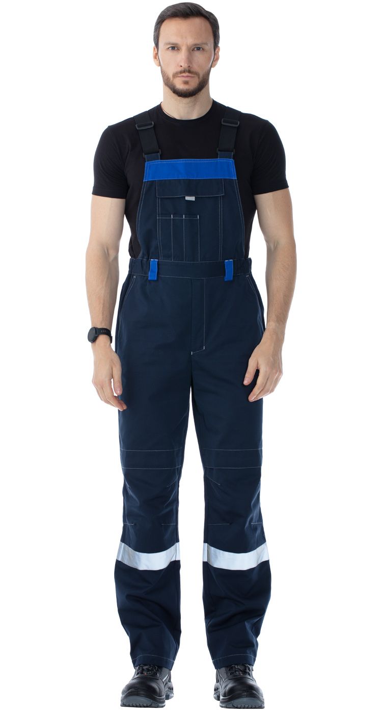 Полукомбинезон с застежкой на гульфик с молнией. Бретели с регулировкой длины из помочной резинки с пряжками. Спереди вместительный накладной карман с широким клапаном на липучке с отделами для тонких инструментов или ручек. Пояс со шлевками. Регулировка объема по талии за счет боковых вставок с эластичной тесьмой.