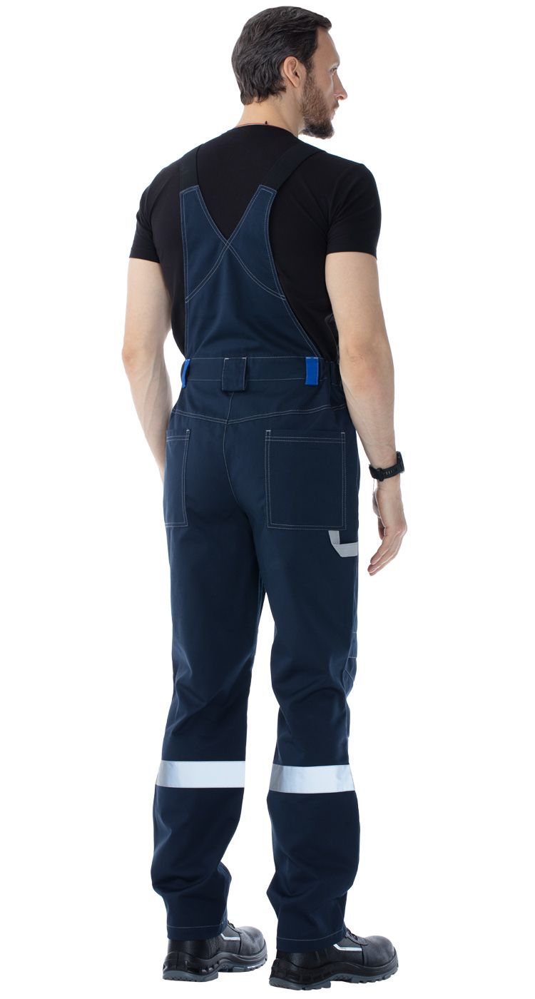 На передних половинках - верхние карманы с боковым входом и карманы для амортизационных вкладышей в области колен на липучках. На задних половинках верхние накладные карманы, а также хлястик для инструментов.