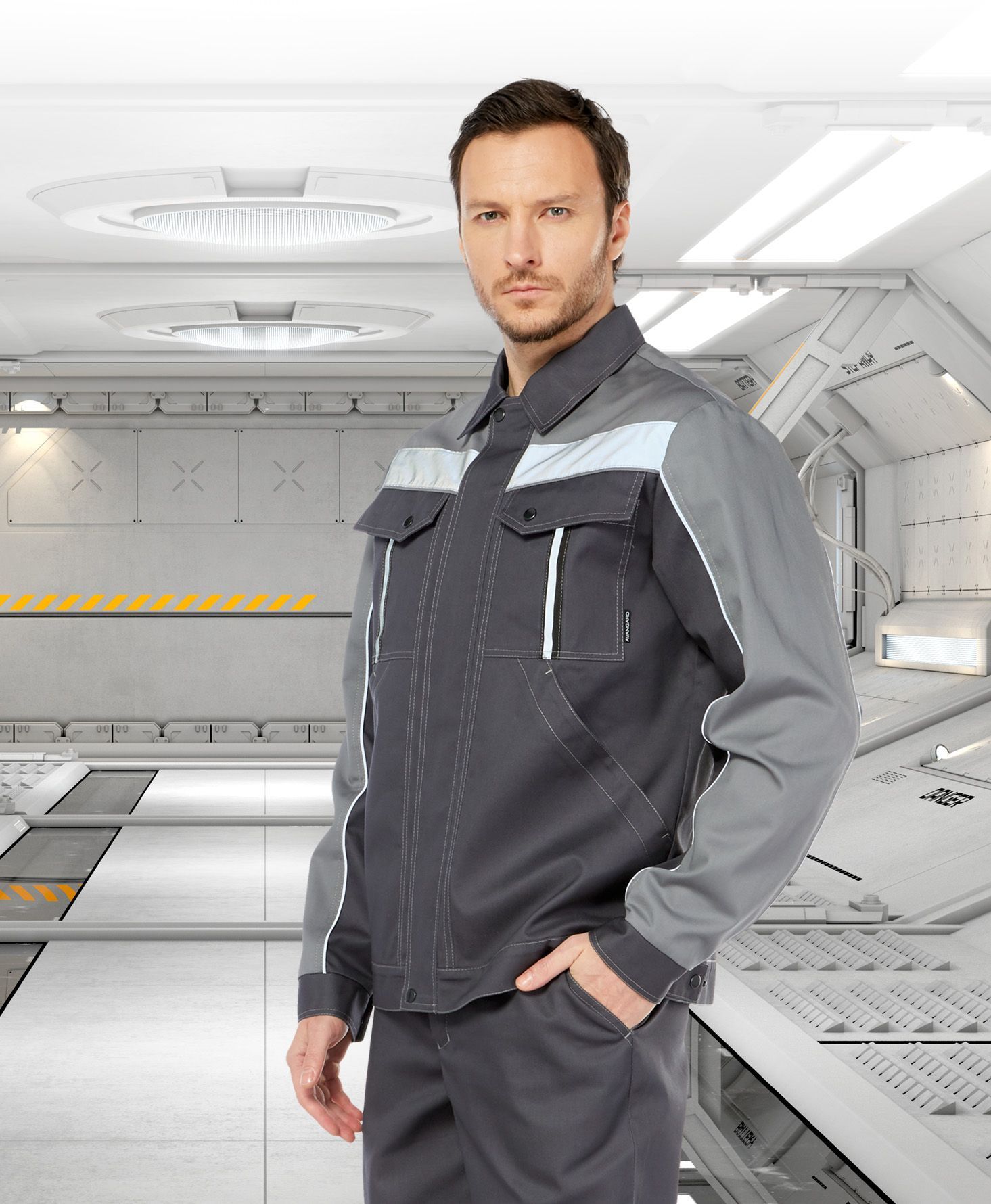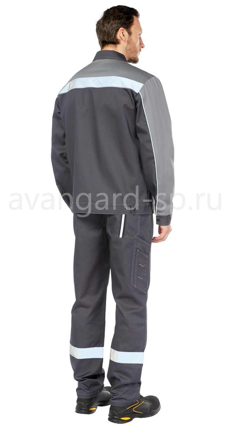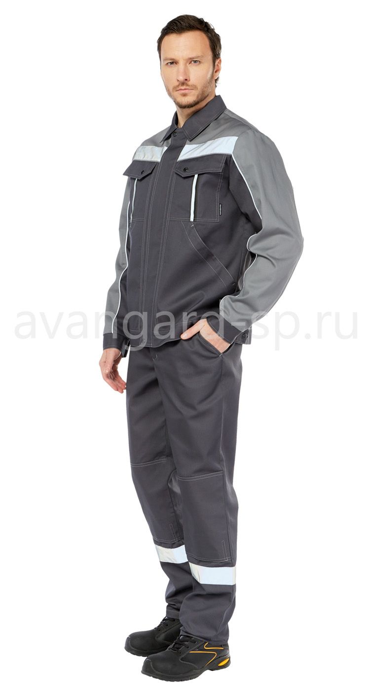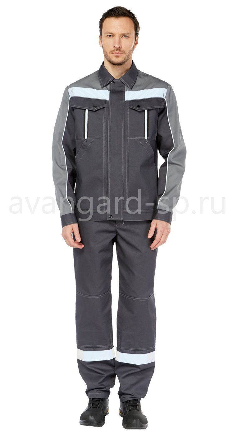 Для обеспечения безопасности в условиях плохой видимости - на кокетках куртки и по низу брюк широкие световозвращающие полосы, на карманах куртки, брюк и вдоль рукавов узкие световозвращающие элементы.