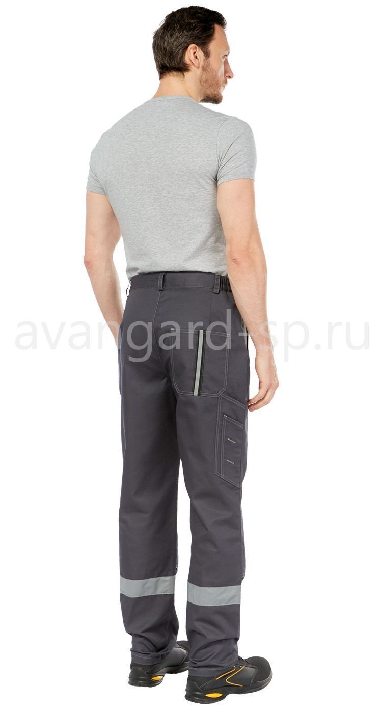 Брюки с гульфиком на молнии и поясом на пуговице со шлевками для ремня. Объем по талии регулируется за счет боковых вставок с эластичной тесьмой. На передних половинках верхние карманы с боковым входом. Сзади справа - накладной карман и карман для инструментов. В области колен - усилительные накладки и карманы для амортизационных вкладышей.