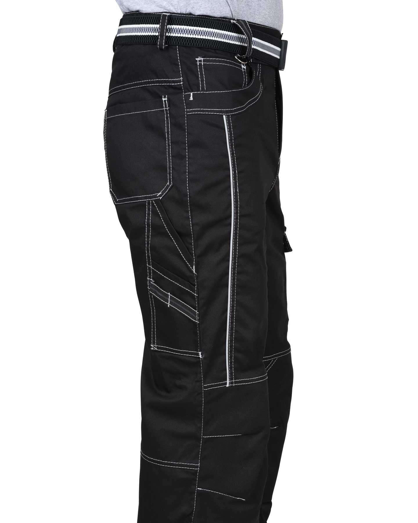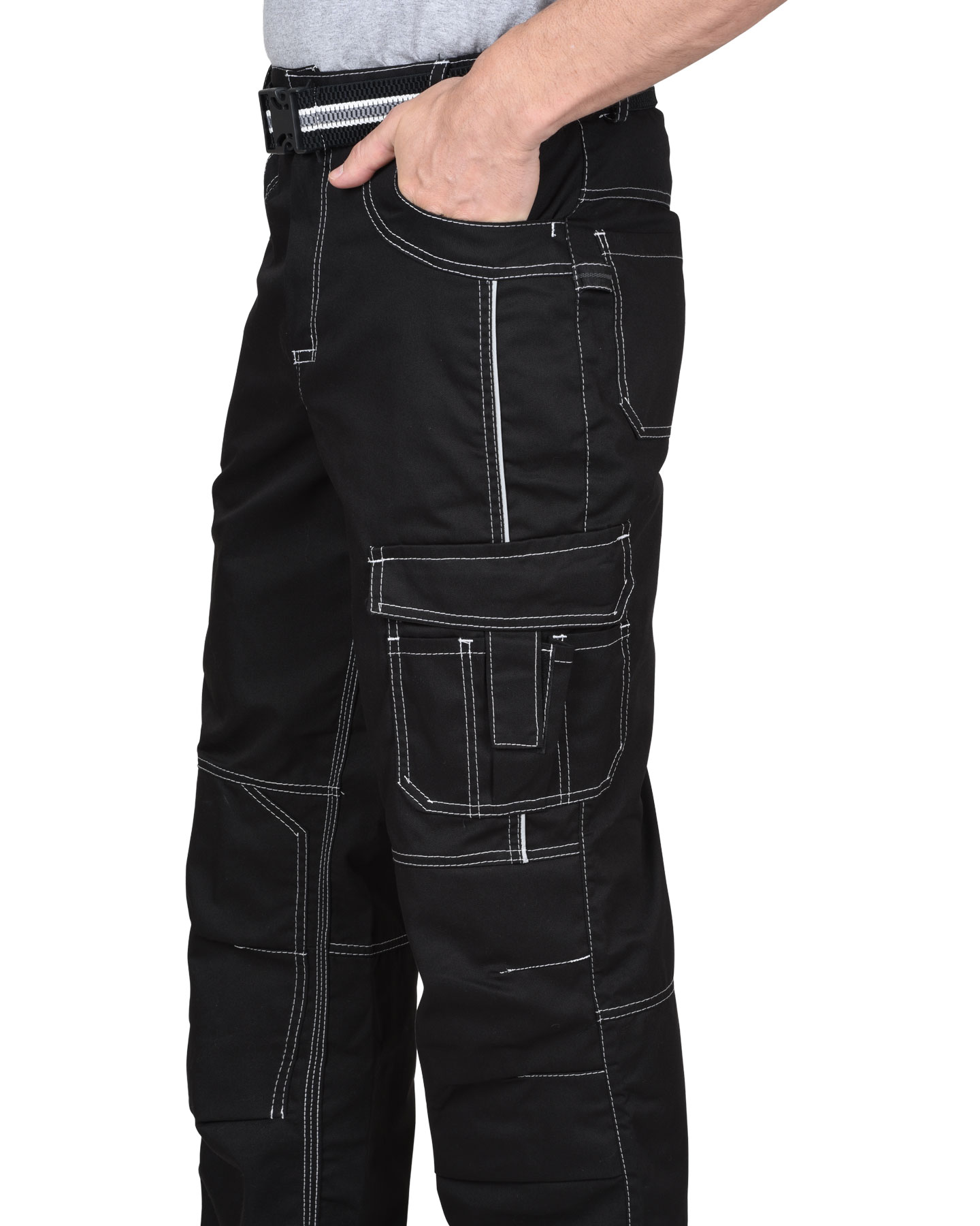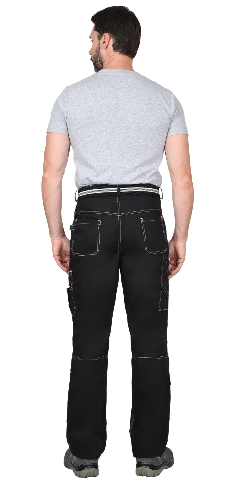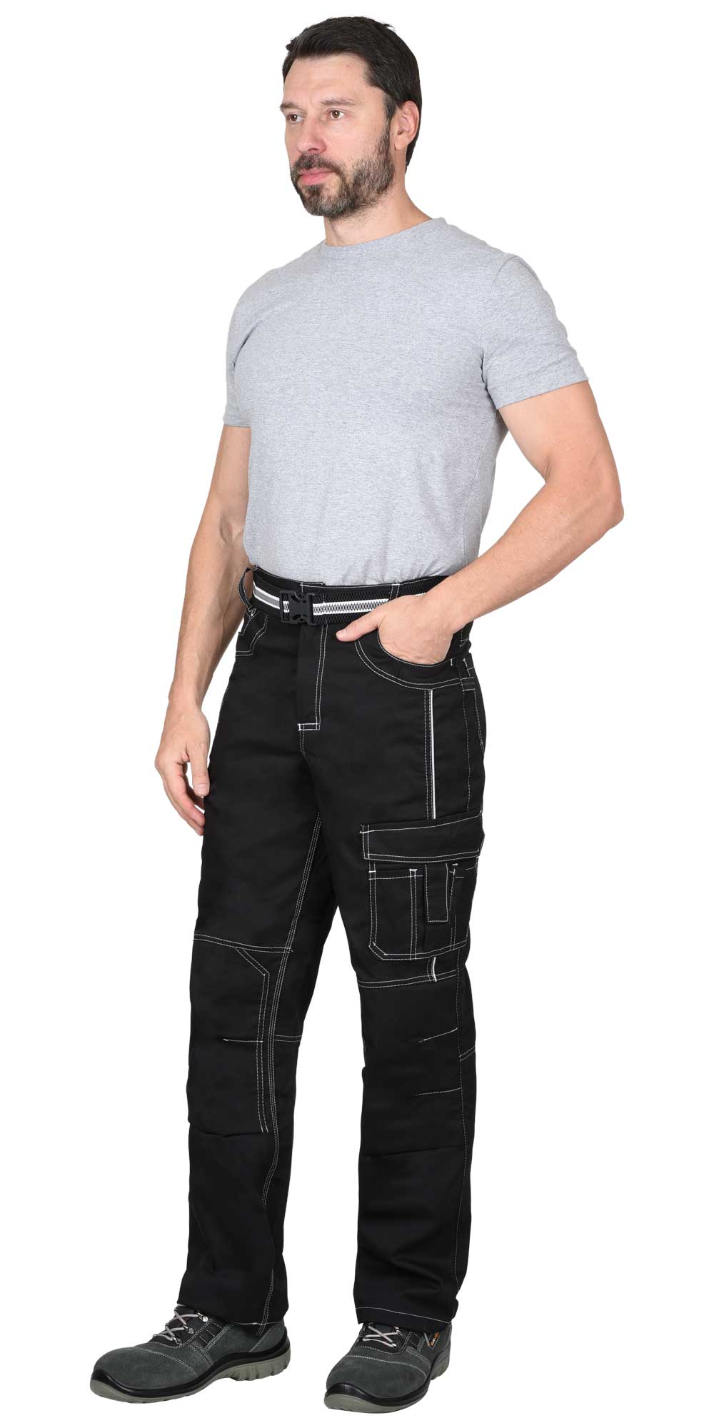 Брюки прямые, на притачном поясе, с застёжкой спереди на молния, с боковыми внутренними карманами, с часовым карманом; на задних половинках с отрезной кокеткой, двумя накладными карманами и карманами под инструменты. В брюках предусмотрен СВ кант для обозначения сигнальной видимости.