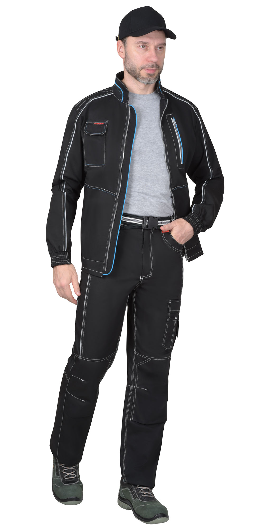 Куртка короткая, воротник стойка; с центральной застёжкой на тракторную тесьму «молнию»; с внутренней подпланкой; с верхним прорезным карманом на тесьму «молнию» на левой полочке, и с верхним накладным полуобъёмным карманом с фигурным клапаном застегивающийся на потайную липучку на правой полочке; с нижними прорезными карманами «листочки», притачной обтачкой низа куртки и манжетами, манжеты частично стянуты резинкой. В куртку предусмотрен СВ кант для обозначения сигнальной видимости. ГОСТ 12.4.280-2014