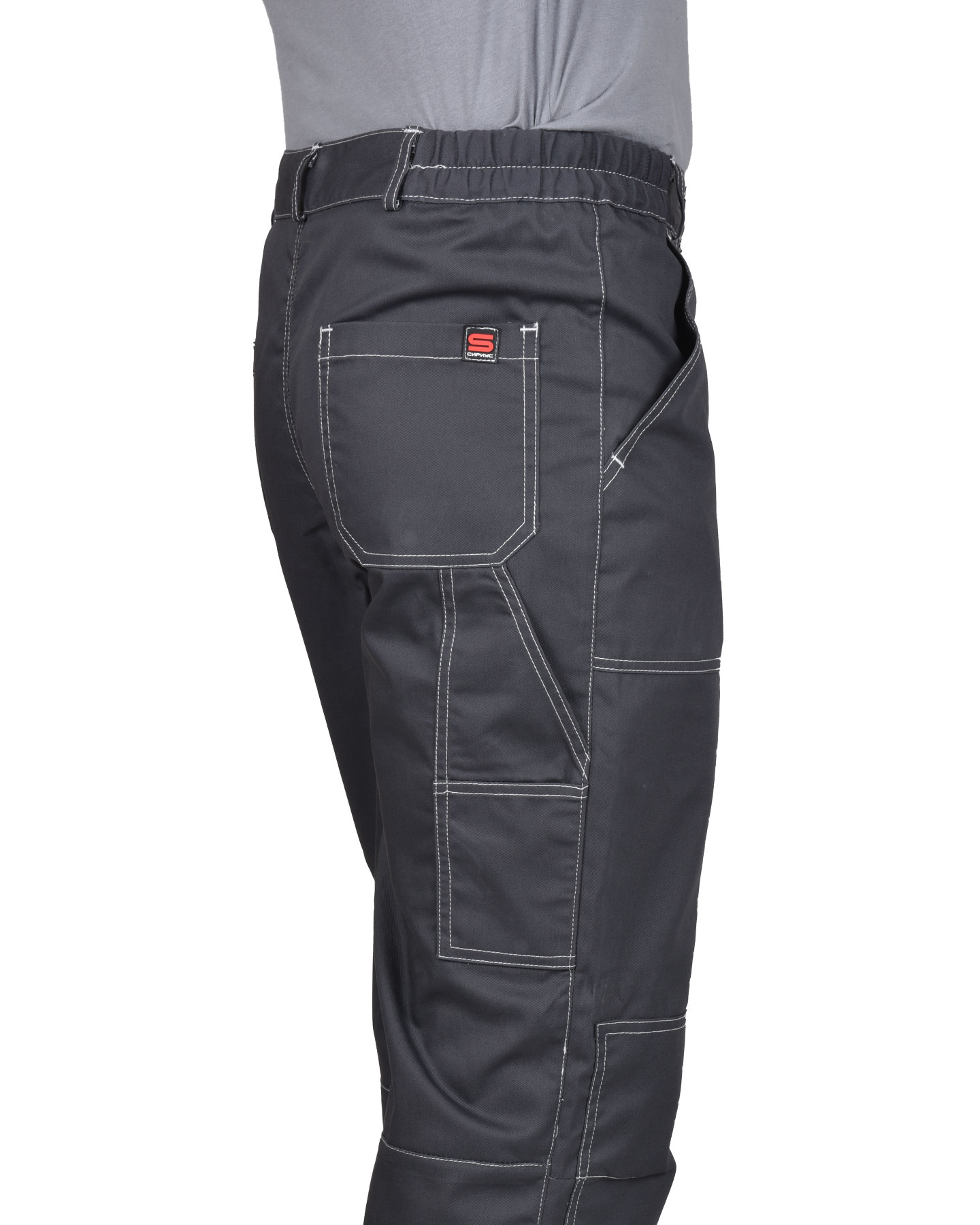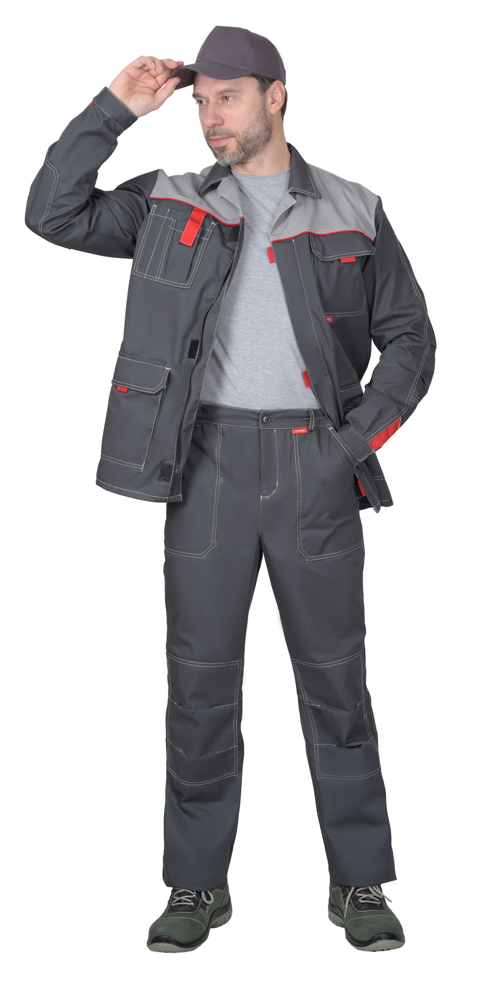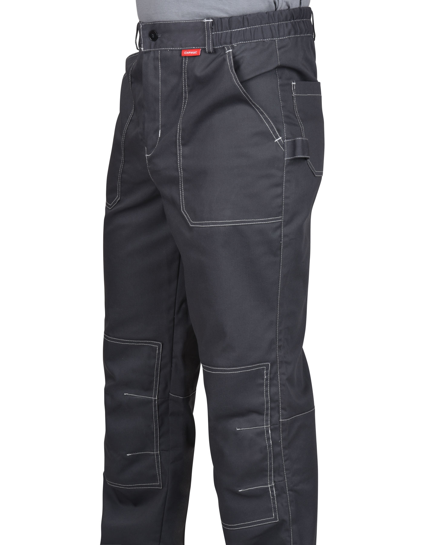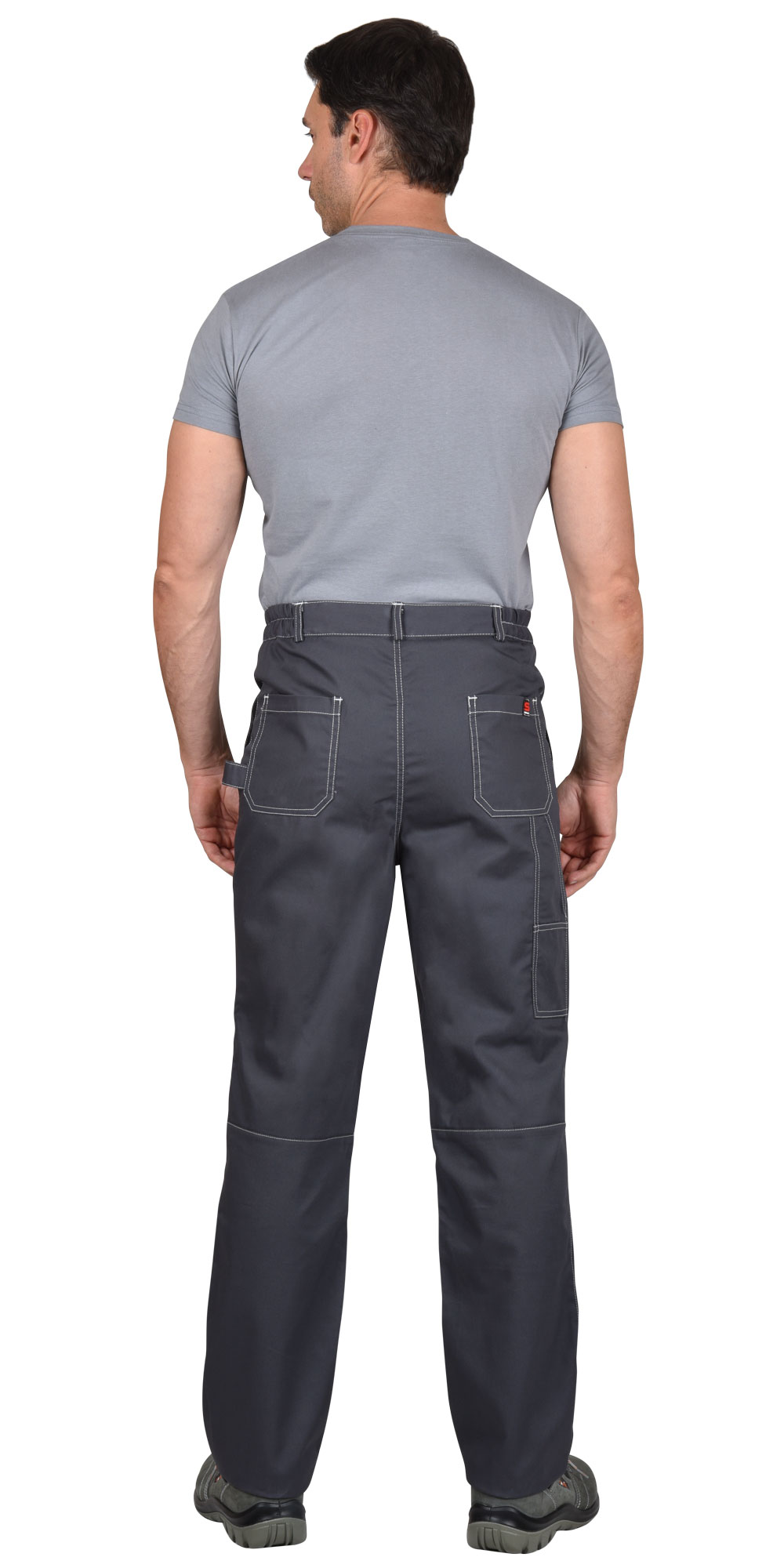 Брюки с застежкой спереди на однозамковую тесьму молния и на одну обметанную петлю и пуговицу на поясе; с различными многофункциональными карманами; обьемными наколенниками; с притачным поясом, частично стянутым резинкой по бокам.