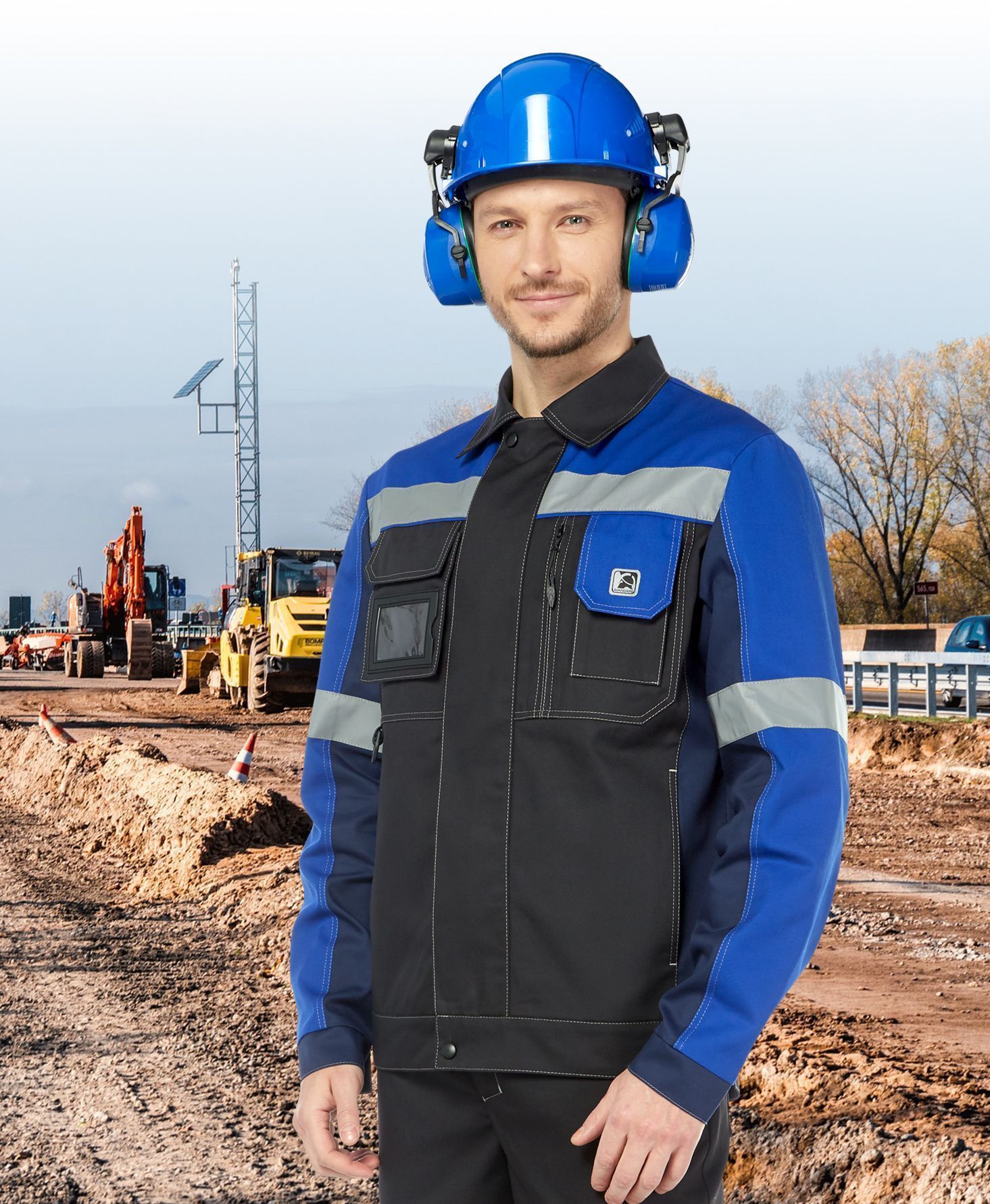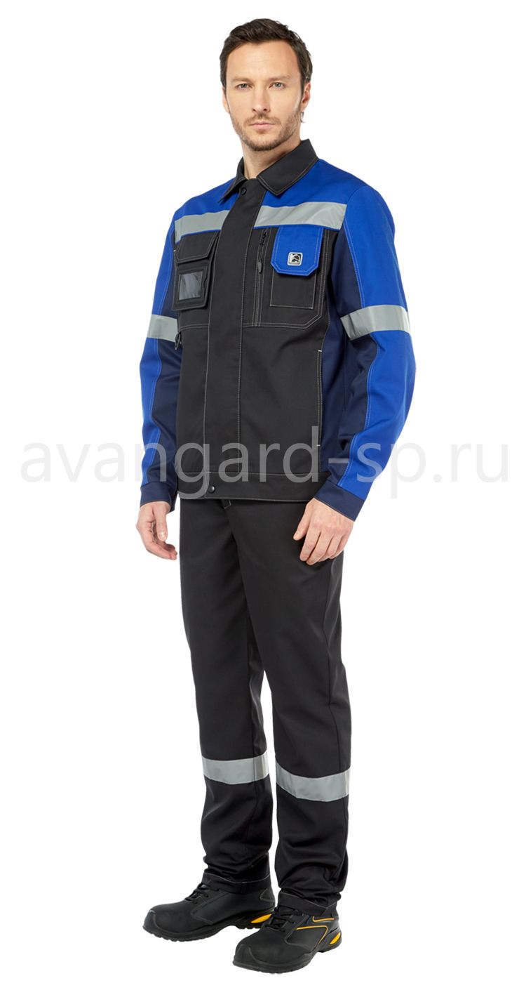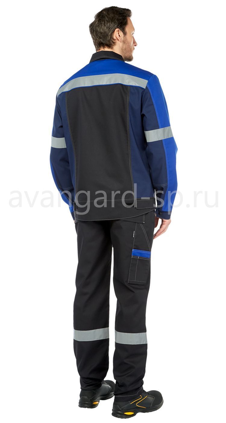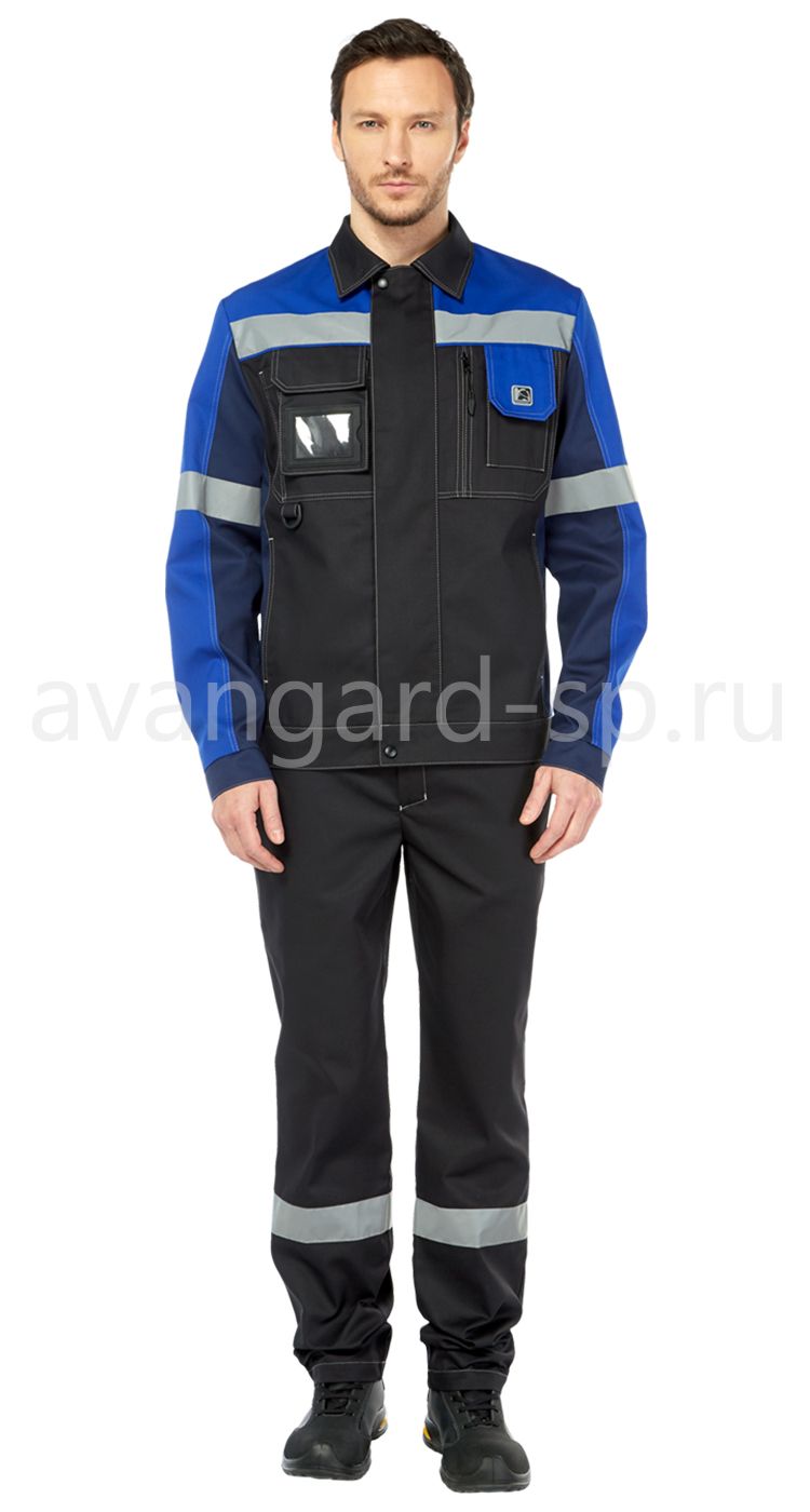 Куртка удлиненная с застежкой на молнию под планкой на липучках и кнопках. Многофункциональные нагрудные карманы: в том числе карман на молнии (для персональных документов, паспорта, пластиковых карт), объемный карман с клапаном для средств связи, накладной карман с клапаном (для небольшого блокнота) с отделением для ручки и съемный карман под бэйдж. Пластиковое полукольцо для крепления пропуска. Нижние карманы в швах рельефов. Спинка с вертикальными рельефами, удлиненная, чтобы не задираться при наклоне работника вперед. Воротник отложной. Широкий пояс по низу куртки с хлястиками на липучке для регулировки объема. Рукава втачные с членениями и с манжетами на кнопке.