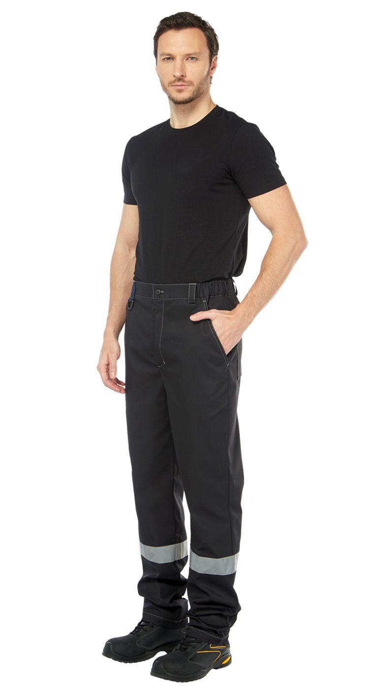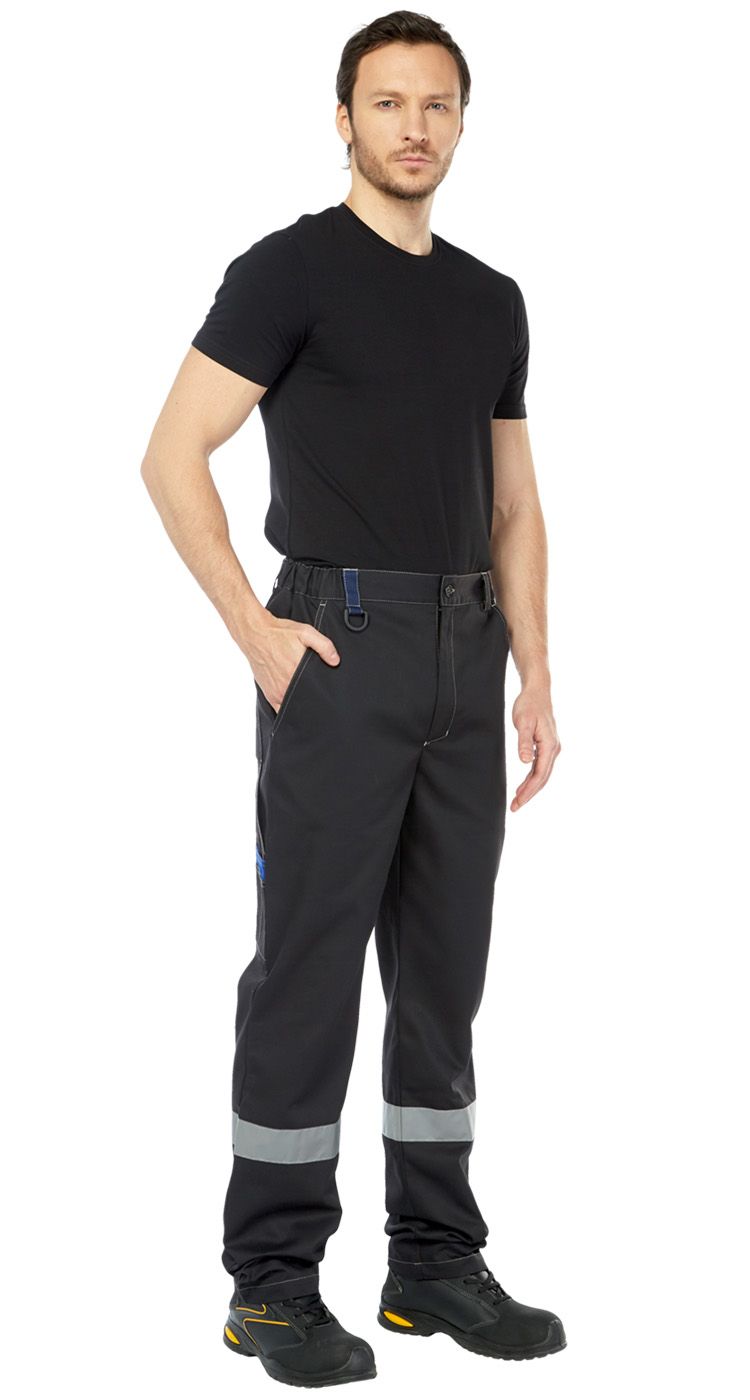 Брюки с застежкой на гульфик с молнией, с поясом со шлевками. На поясе эластичные вставки по бокам для регулировки объема. На передних половинках верхние боковые карманы. На задних половинках верхние накладные карманы с объемом в нижней части и карманы для инструментов.