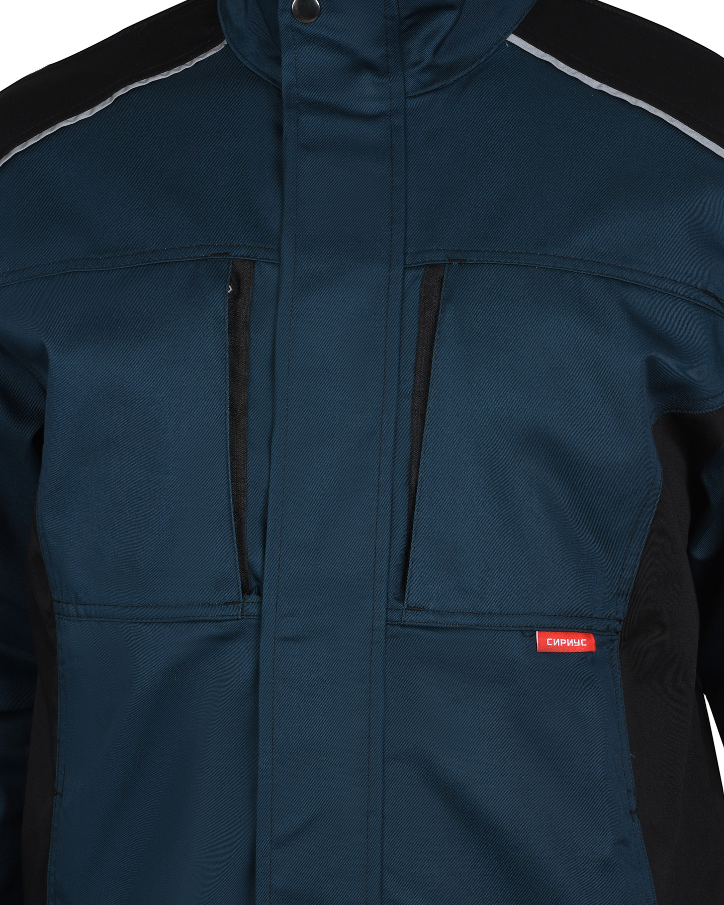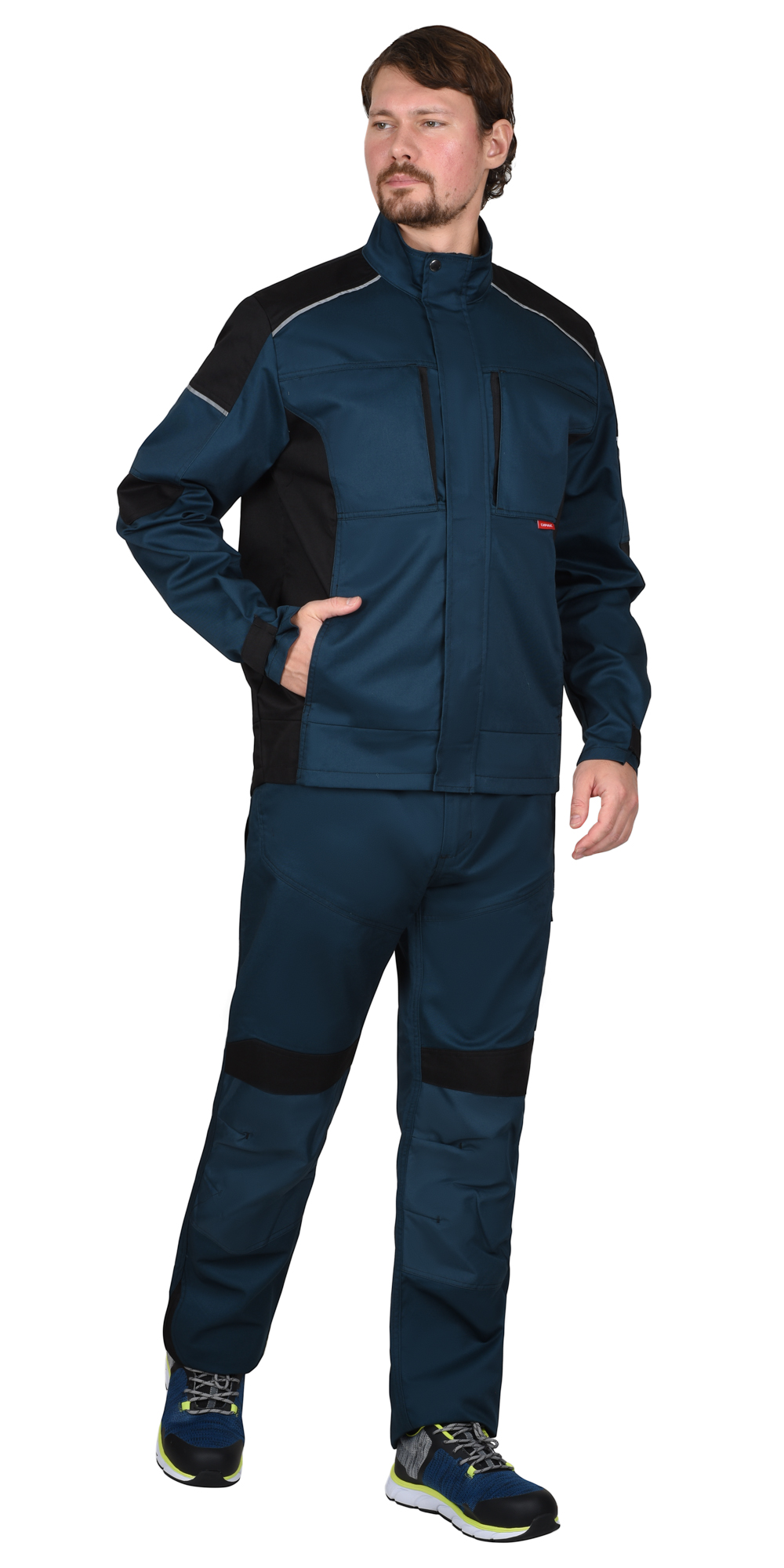 Куртка двухцветная, прямого силуэта, укороченная, с воротником стойка, с центральной застёжкой на молнию от края воротника до низа, накрытую ветрозащитной планкой и внутренней короткой планкой по правому борту, с нагрудными карманами с молнией, с нижними карманами в шве. Рукава втачные, объём по низу рукава регулируется хлястиком с текстильной застёжкой «липучка». В куртке предусмотрен СВ кант.