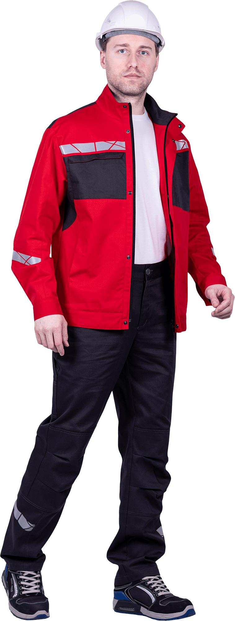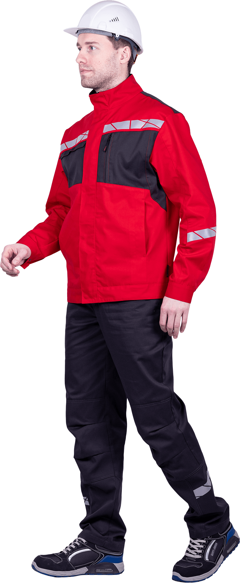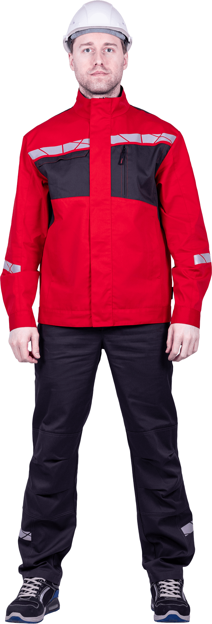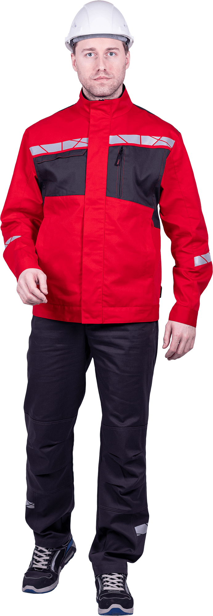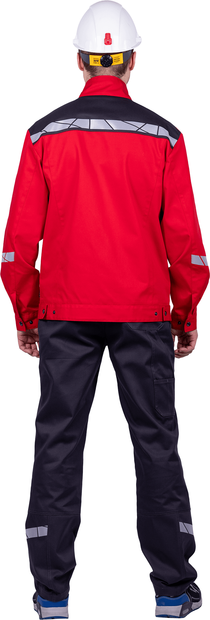 • термоклеевая световозвращающая полоса шириной 30 мм располагается по кокеткам полочек и спинки, низу центральной части рукавов