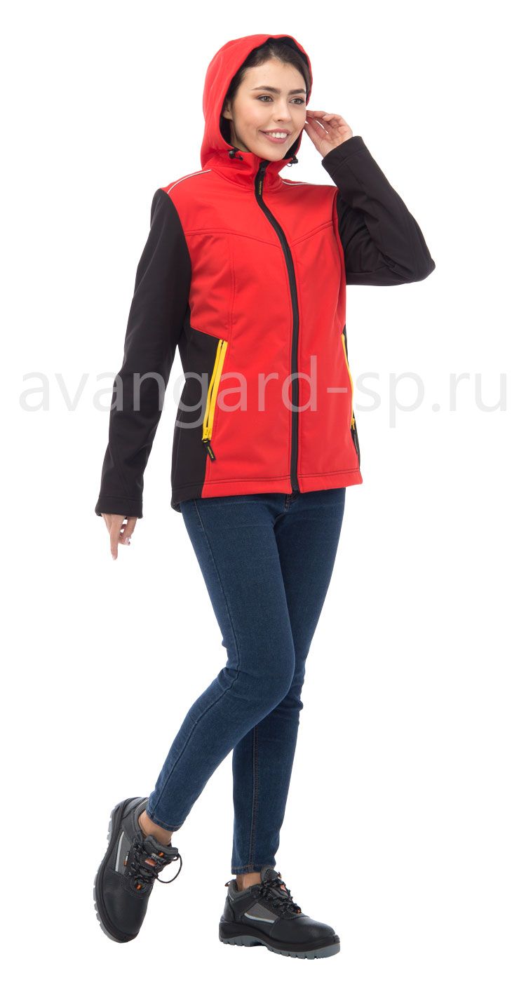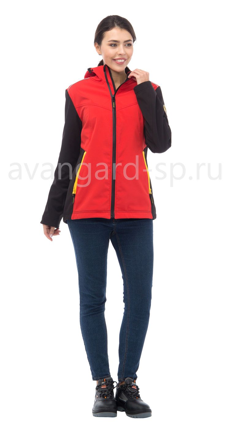 Куртка женская с капюшоном из трехслойного материала softshell, обладающего высокими ветро- и водонепроницаемыми свойствами. Куртка полуприлегающего силуэта с центральной застежкой на прорезиненную молнию. Наклонные рельефные швы от кокетки. Нижние карманы с прорезиненными молниями. Спинка с кокеткой и вертикальными рельефами. Кулиса по низу куртки для регулировки объема. Удобная мягкая внутренняя планка застежки. Рукава втачные эргономичной формы. Люверсы с сеткой для вентиляции в нижней части рукавов. Световозвращающие канты спереди и сзади под кокетками. Капюшон с кулисой по лицевой части для регулировки объема. Внутренние карманы для телефона и документов формата А4. Дополнительный комфорт в носке обеспечивается стрейчевыми свойствами материала (4-way stretch).