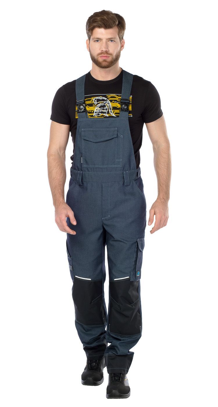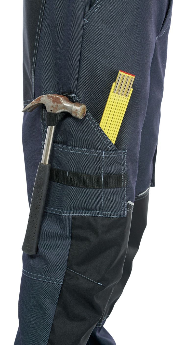 Пояс со шлевками для ремня. Эффективная эластичная регулировка объема по талии. Верхние карманы с наклонным входом. Боковые накладные карманы в области середины бедер: слева карман-полупортфель с клапаном, справа для инструментов с отделом для ручки, а также со стропой и петлей для молотка.