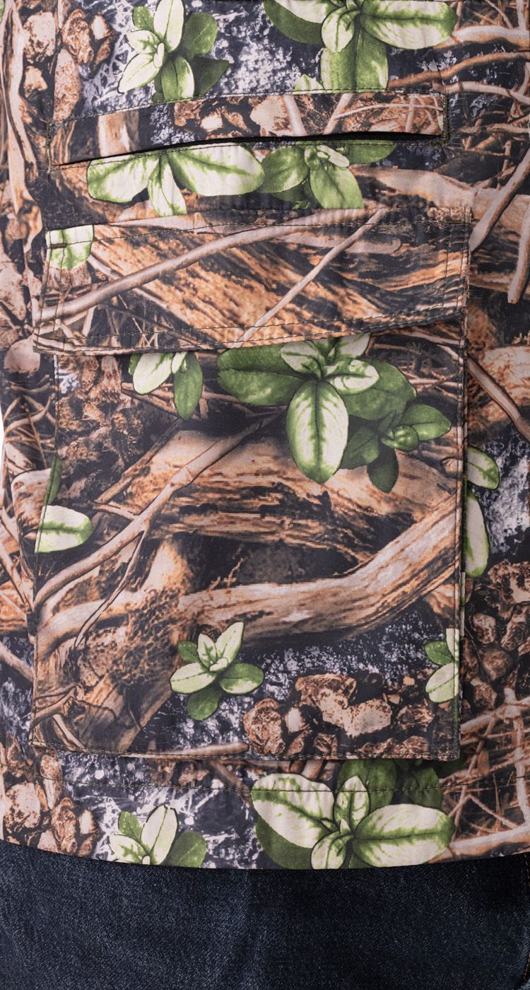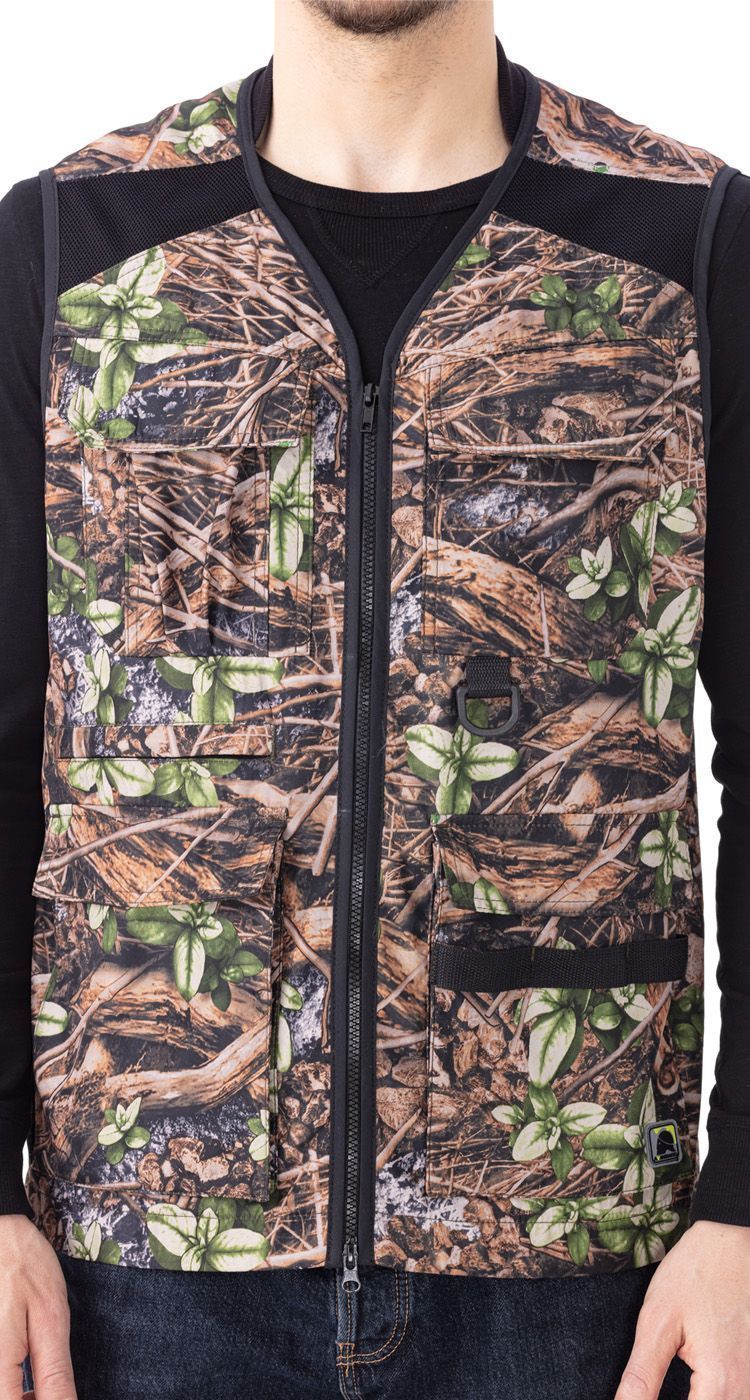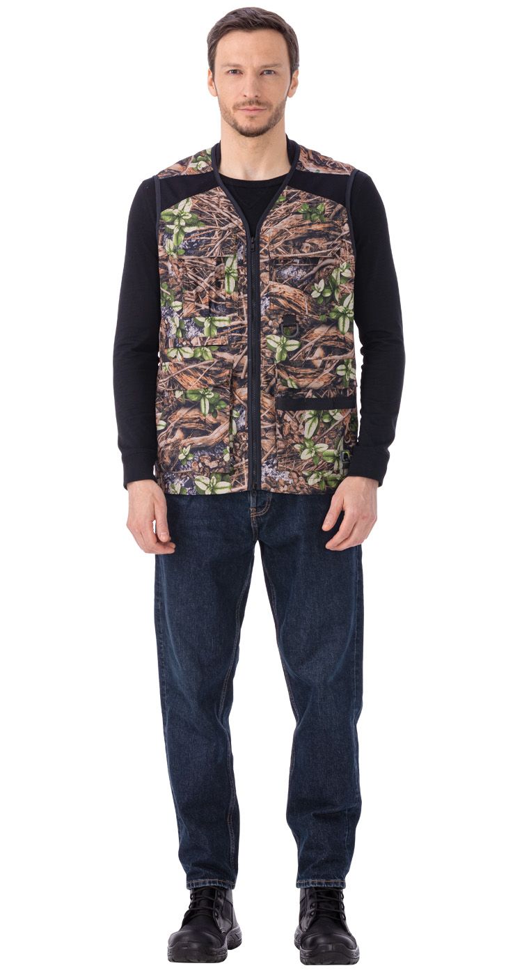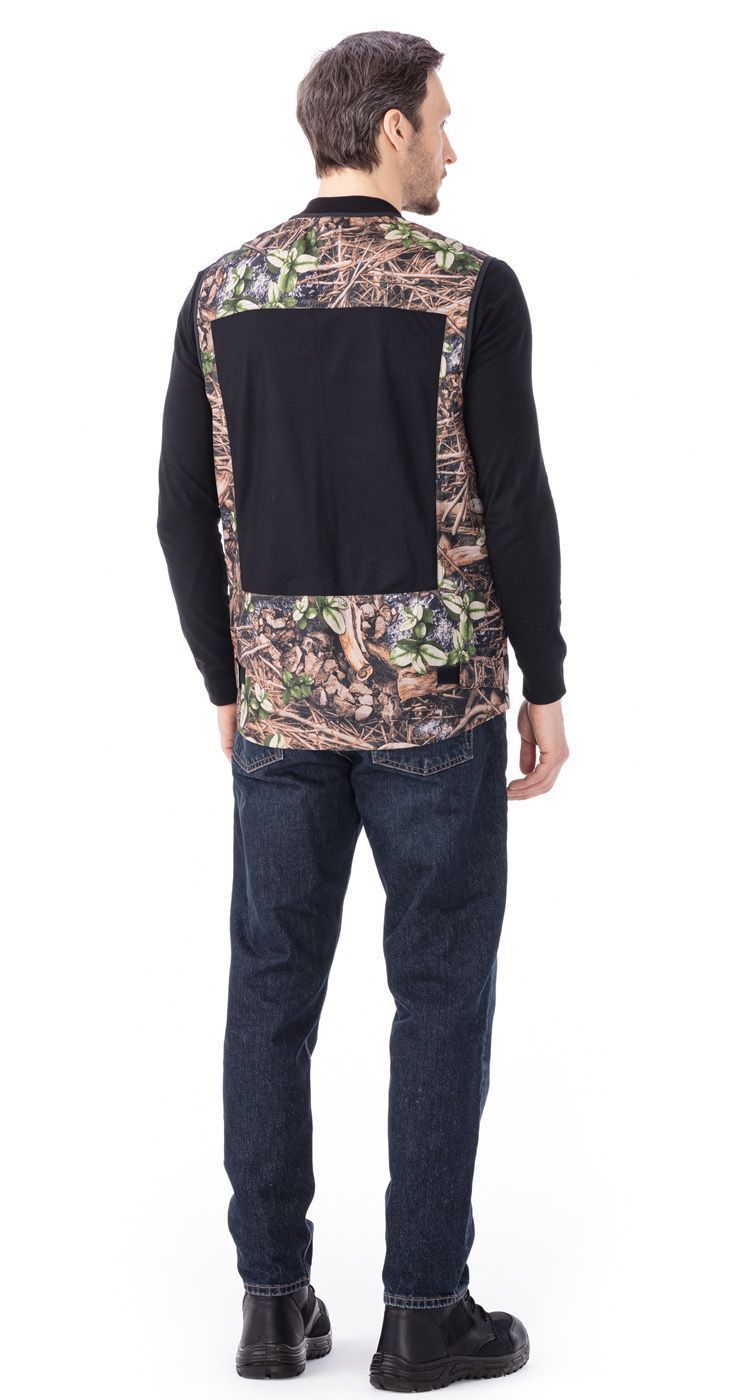 На полочках верхние накладные карманы с клапанами на липучке. На правой полочке карман для рации. На правой полочке на уровне линии талии карман на молнии. По низу жилета карманы-полупортфели с клапанами на липучках. На плечах спереди и на средней части спинки вставки из сетки. По низу спинки хлястики на липучке для регулировки объема.