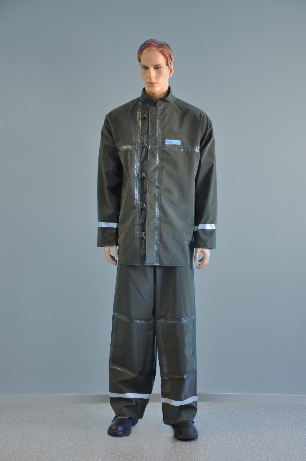 - Ткань: костюм изготовлен из специальной прочной ткани с ПВХ покрытием, вес ткани 500 гр. / кв. м. Водоупорность — не менее 10.000 мм. вод. столба. Повышенные прочностные характеристики. Очень высокие показатели износостойкости. Цвет: зеленый. Ткань экологична и соответствует Европейскому стандарту EN 71 PART3