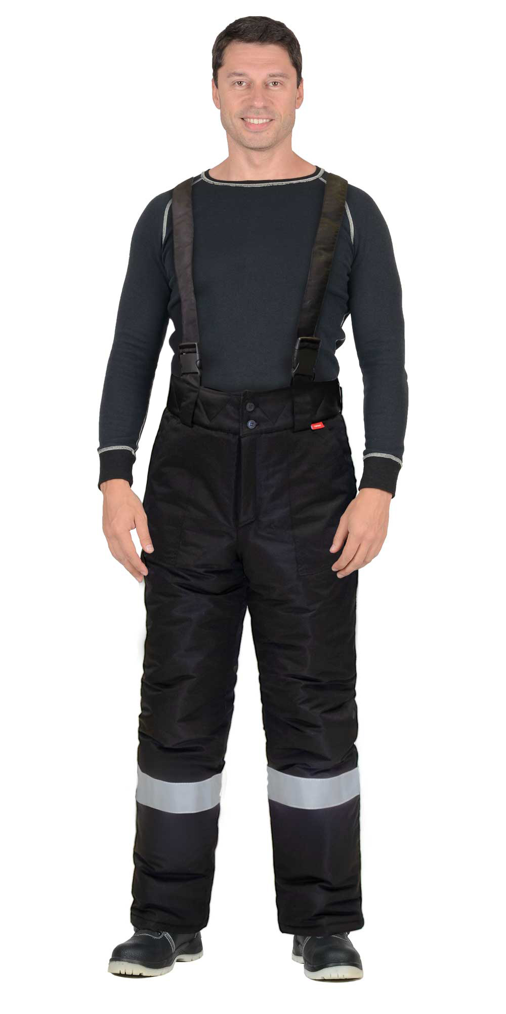 Брюки прямые на утеплённой подкладке, с застежкой спереди на гульфик с молнией. Брюки с фигурным широким поясом с застежкой на 2 пуговицы, с боковыми накладными карманами, со съёмными бретелями. Бретели пристегиваются к брюкам при помощи пуговиц и петель, регулируются по длине защелками-фастексами.