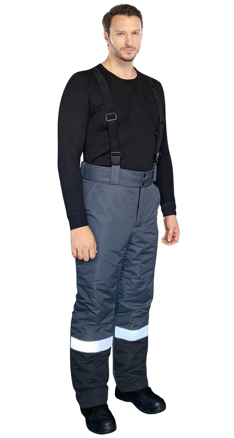На передних половинках брюк расположены усилительные накладки в области коленей, детали из плотной, устойчивой к истиранию ткани в нижней части, разрезы на молнии под планкой, для удобства надевания на зимнюю обувь, и световозвращающие полосы для безопасности при работе в условиях плохой видимости. На задней правой половинке брюк расположен накладной карман под клапаном.