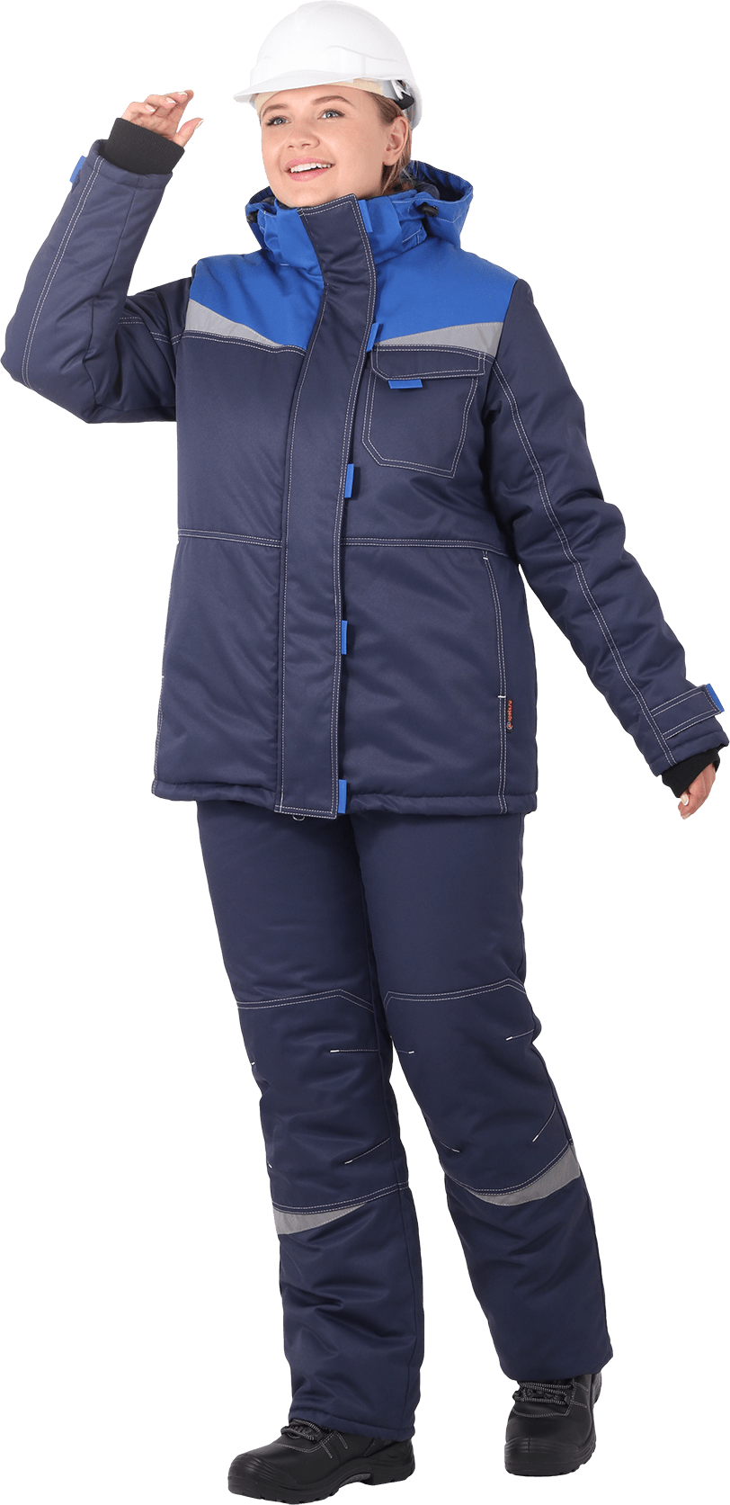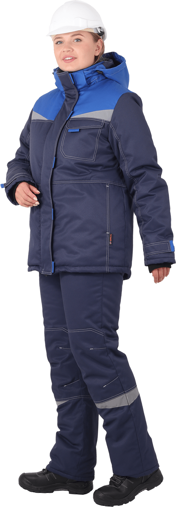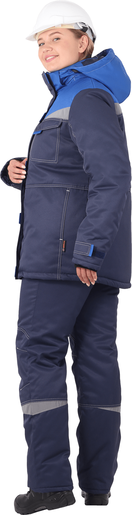 Костюм состоит из куртки и брюк. В костюме используются световозвращающие