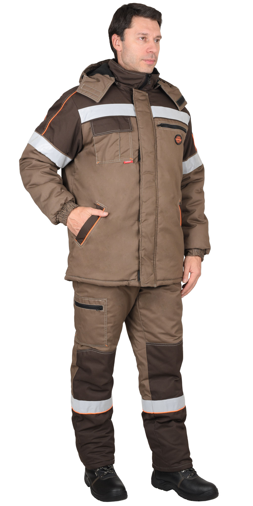 БРЮКИ прямые, с бретелями, с притачной утеплённой подкладкой, с центральной застежкой гульфика на тесьму «молния», широким фигурным поясом, с застежкой на поясе на две пуговицы, с тремя узкими шлевками на задних половинках и двумя щлевками-держателями фастексов на передних половинках. Внутренние боковые карманы с наклонным входом, с накладным карманом на правом боковом шве, застегивающимся на тесьму «молния». Наколенники на передних половинках, накладные задние карманы. СОП 50мм для обеспечения видимости.