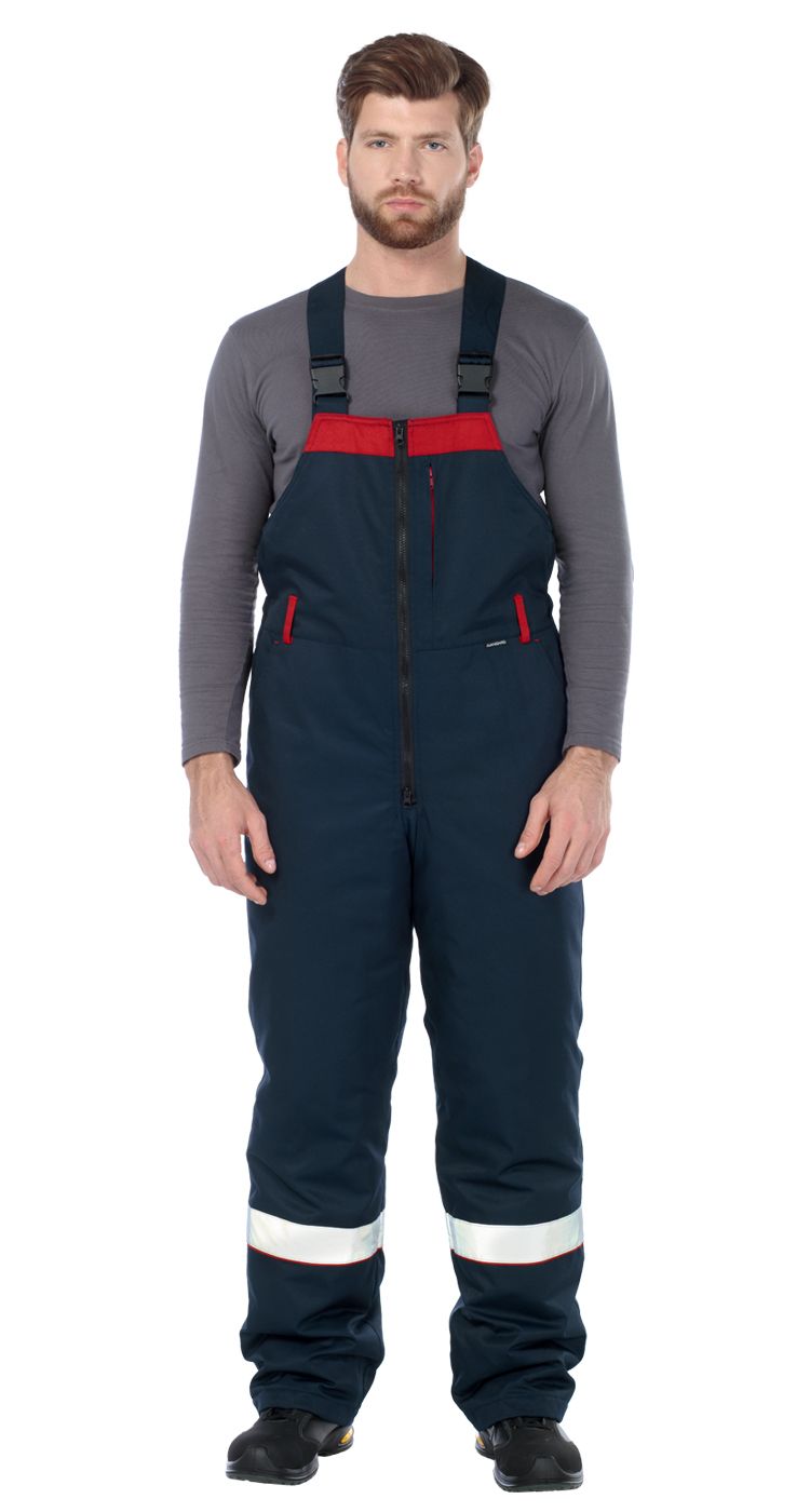 На кокетках куртки и по низу полукомбинезона расположены широкие световозвращающие полосы для безопасности при работе в условиях плохой видимости.