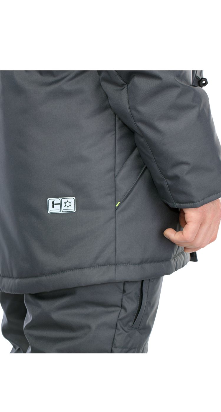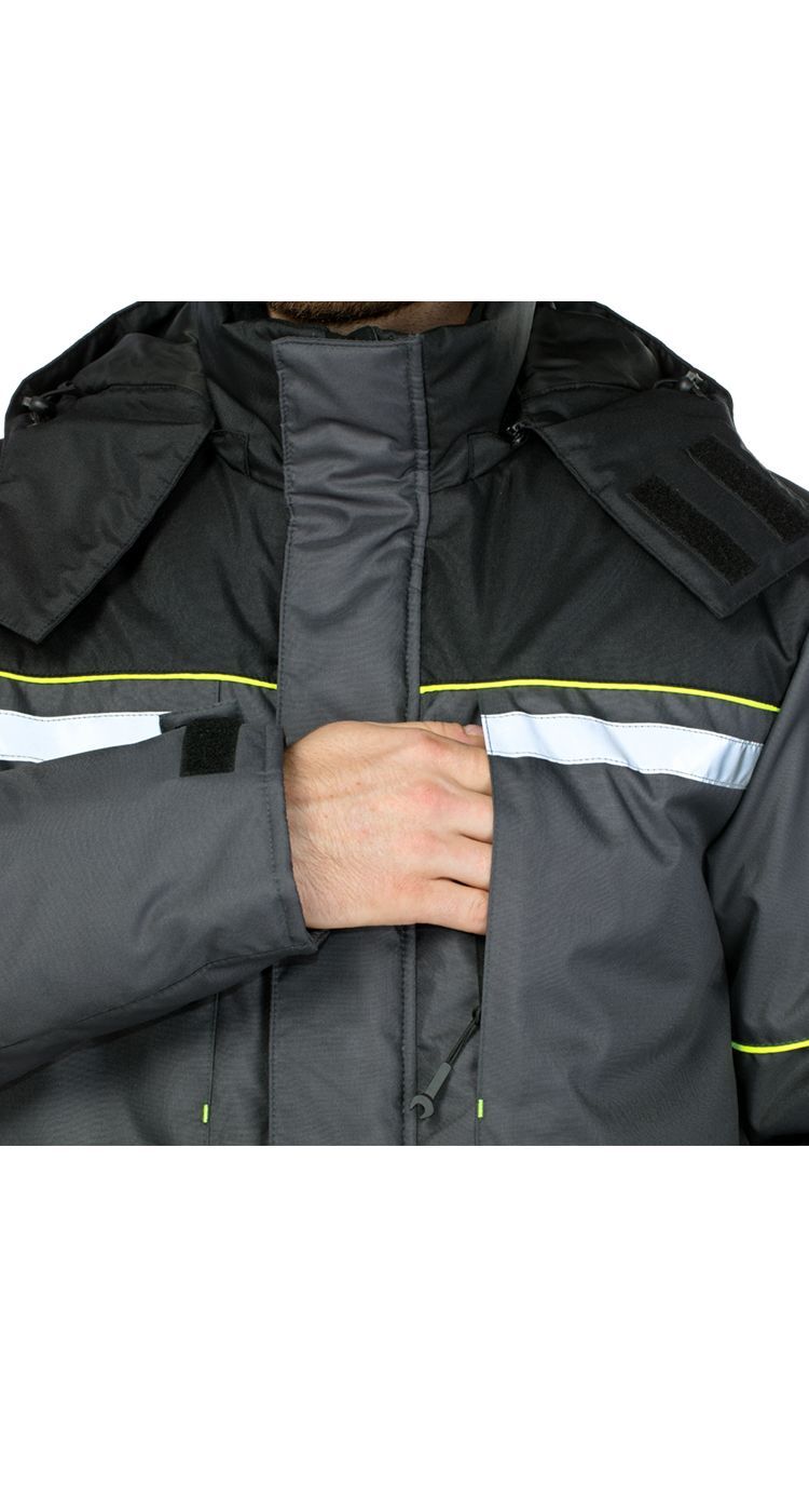 Куртка удлиненная, с центральной застежкой на молнию под ветрозащитной планкой на липучках. Вместительные нагрудные и нижние карманы на молниях, защищенные от попадания снега. Для обеспечения безопасности носителя в условиях плохой видимости на нагрудных карманах расположены световозвращающие полосы.